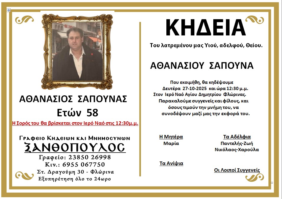 ΚοινωνικάΚηδεία του Αθανασίου Σαπουνά, ετών 58 Κυριακή 26 Οκτωβρίου, 2025 18:56 florinapress.gr SHARE Ίσως να ενδιαφέρει ... Κηδεία της Αργυρώς Ζαφειρίου ετών 64 Κηδεία του Δημητρίου Ανδρεάδη, ετών 72 Κηδεία της Ευαγγελίας Παρασκευοπούλου, ετών 84 Κηδεία της Άννας Κατίνη, ετών 84 Κηδεία του Ευαγγέλου Πέτλη, ετών 92 Share Ακολουθήστε μας8.4kFollowersLikeΤελευταία νέα Ψήφισμα του Συνδέσμου Μοναστηριωτών και των Πέριξ εν Φλωρίνη «Η ΕΛΠΙΣ» Κοινωνία Σάββατο 6 Δεκεμβρίου, 2025 Ψήφισμα του Δημοτικού Συμβουλίου Φλώρινας Κοινωνία Σάββατο 6 Δεκεμβρίου, 2025 Συλλυπητήριο μήνυμα του Δημάρχου Φλώρινας Κοινωνία Σάββατο 6 Δεκεμβρίου, 2025 Δήλωση Στήριξης του Εμπορικού Συλλόγου Αμυνταίου προς τους Αγρότες Κοινωνία Σάββατο 6 Δεκεμβρίου, 2025