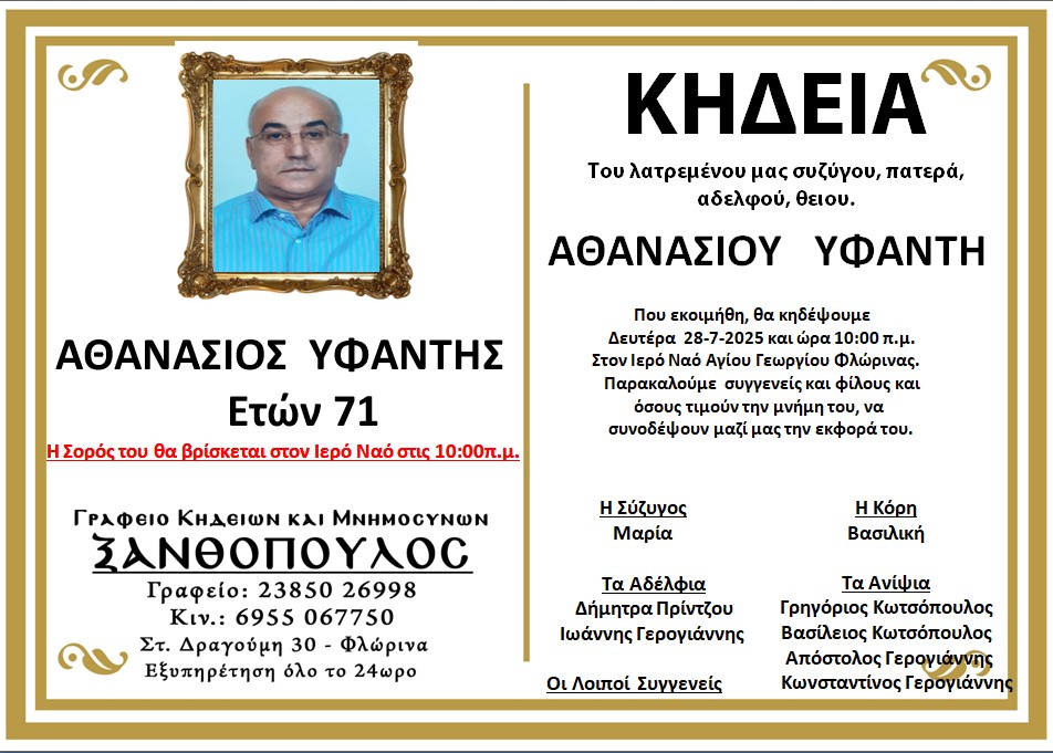 ΚοινωνικάΚηδεία του Αθανασίου Υφαντή, ετών 71 Κυριακή 27 Ιουλίου, 2025 22:51 florinapress.gr SHARE Ίσως να ενδιαφέρει ... Κηδεία του Γεωργίου Παπά, ετών 68 Κηδεία της Αγουρίτσας Κατακαλίδου Κηδεία του Παναγιώτη Τέγου, ετών 90 Μνημόσυνα Σαββάτου 1 και Κυριακής 2 Μαρτίου Κηδεία του Λάζαρου Τσιγλόπουλου Share Ακολουθήστε μας8.4kFollowersLikeΤελευταία νέα Την Τετάρτη 10 Δεκεμβρίου η φωταγώγηση του Χριστουγεννιάτικου Δέντρου στην κεντρική πλατεία της Φλώρινας Εκδηλώσεις Πολιτισμός Παρασκευή 5 Δεκεμβρίου, 2025 Χριστουγεννιάτικη συναυλία της Φιλαρμονικής Δήμου Φλώρινας Εκδηλώσεις Πολιτισμός Παρασκευή 5 Δεκεμβρίου, 2025 Η νέα σύνθεση της Δημοτικής Τοπικής Οργάνωσης (ΔΗΜΤΟ) Νέας Δημοκρατίας Αμυνταίου Πολιτική Παρασκευή 5 Δεκεμβρίου, 2025 Μήνυμα του Δημάρχου Φλώρινας για την Παγκόσμια Ημέρα Εθελοντισμού Κοινωνία Πολιτική Παρασκευή 5 Δεκεμβρίου, 2025
