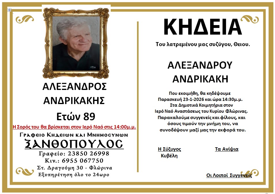 ΚοινωνικάΚηδεία του Αλέξανδρου Ανδρικάκη, ετών 89 Πέμπτη 22 Ιανουαρίου, 2026 20:49 florinapress.gr SHARE Ίσως να ενδιαφέρει ... Κηδεία του Γεωργίου Κύρτσου Κηδεία της Βασιλικής Ευθυμιάδου, ετών 70 Κηδεία της Αμαλίας Ατματζίδου, ετών 65 Κηδεία του Τριαντάφυλλου Φουδούλη Κηδεία του Αθανασίου Ρίση, ετών 93 Share Ακολουθήστε μας8.4kFollowersLikeΤελευταία νέα Ευχαριστήριο μήνυμα προς το Νοσοκομείο Φλώρινας Κοινωνία Πέμπτη 22 Ιανουαρίου, 2026 Ετήσιος χορός του Πολιτιστικού Συλλόγου Σιταριάς “Νέοι Ορίζοντες” Εκδηλώσεις Πολιτισμός Πέμπτη 22 Ιανουαρίου, 2026 Ευχαριστήριο στο Νοσοκομείο Φλώρινας Κοινωνία Πέμπτη 22 Ιανουαρίου, 2026 Ζητείται εργασία Κοινωνία Πέμπτη 22 Ιανουαρίου, 2026