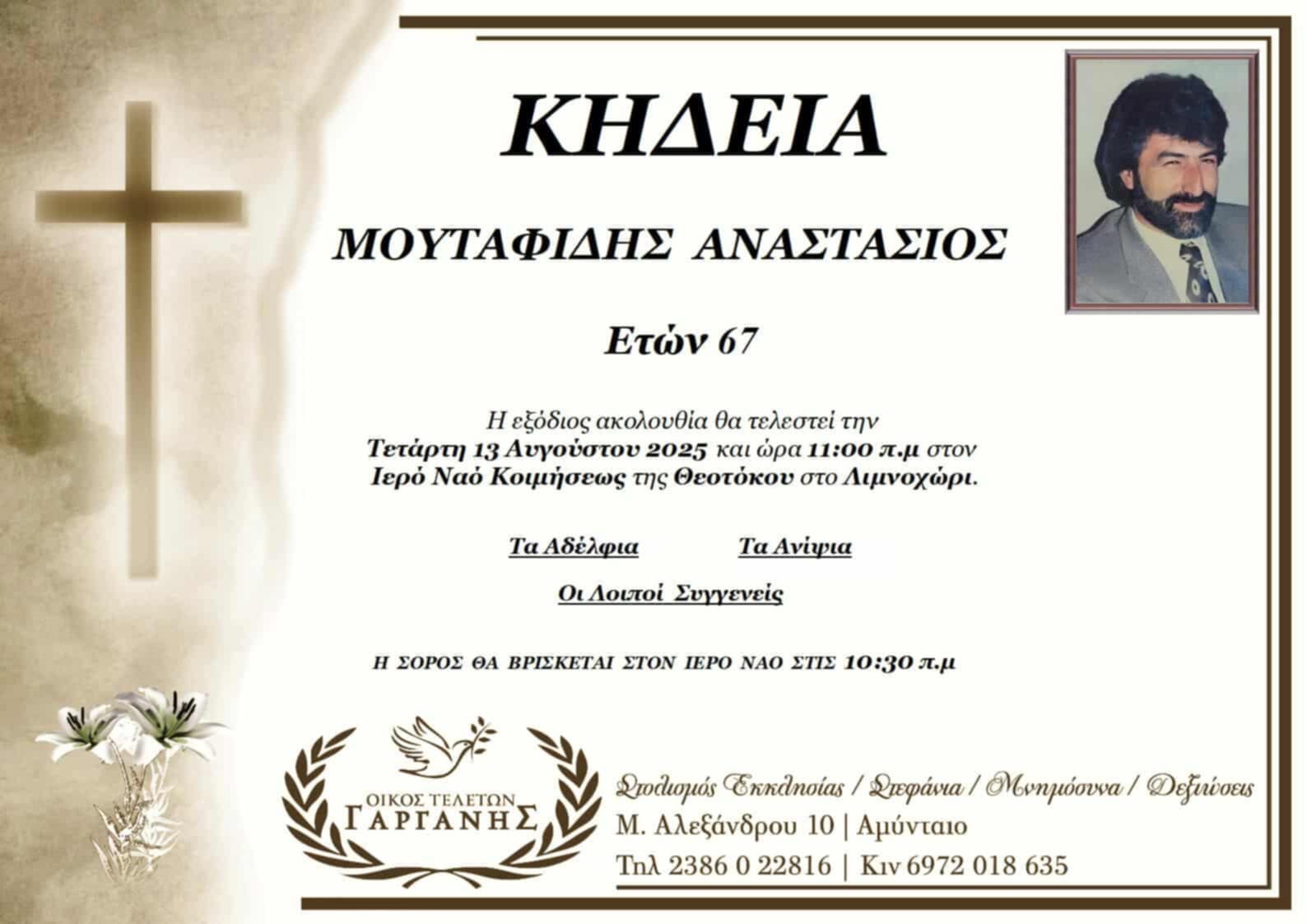 ΚοινωνικάΚηδεία του Αναστασίου Μουταφίδη, ετών 67 Τρίτη 12 Αυγούστου, 2025 20:22 florinapress.gr SHARE Ίσως να ενδιαφέρει ... Κηδεία του Χρήστου Βότση, ετών 92 Κηδεία του Παύλου Σταθόπουλου, ετών 89 Συλλυπητήριο μήνυμα του Βουλευτή Γιάννη Αντωνιάδη Κηδεία του Γεωργίου Γαργάνη, ετών 53 Κηδεία της Βιργινίας (Βέρας) Τώνα, ετών 72 Share Ακολουθήστε μας8.4kFollowersLikeΤελευταία νέα Αγανακτισμένοι αγρότες : Ως εδώ, η κατάσταση δεν πάει άλλο Κοινωνία Πέμπτη 4 Δεκεμβρίου, 2025 Επισκέψεις Κινητών Μονάδων Υγείας σε απομακρυσμένες Κοινότητες του Δήμου Αμυνταίου Κοινωνία Πέμπτη 4 Δεκεμβρίου, 2025 Ευχαριστήρια επιστολή του Πειραματικού Σχολείου Φλώρινας προς το Κέντρο Περιβαλλοντικής Εκπαίδευσης & Αειφορίας Μελίτης Κοινωνία Πέμπτη 4 Δεκεμβρίου, 2025 Πωλείται Γερμανικός λέβητας ξύλου Κοινωνία Πέμπτη 4 Δεκεμβρίου, 2025