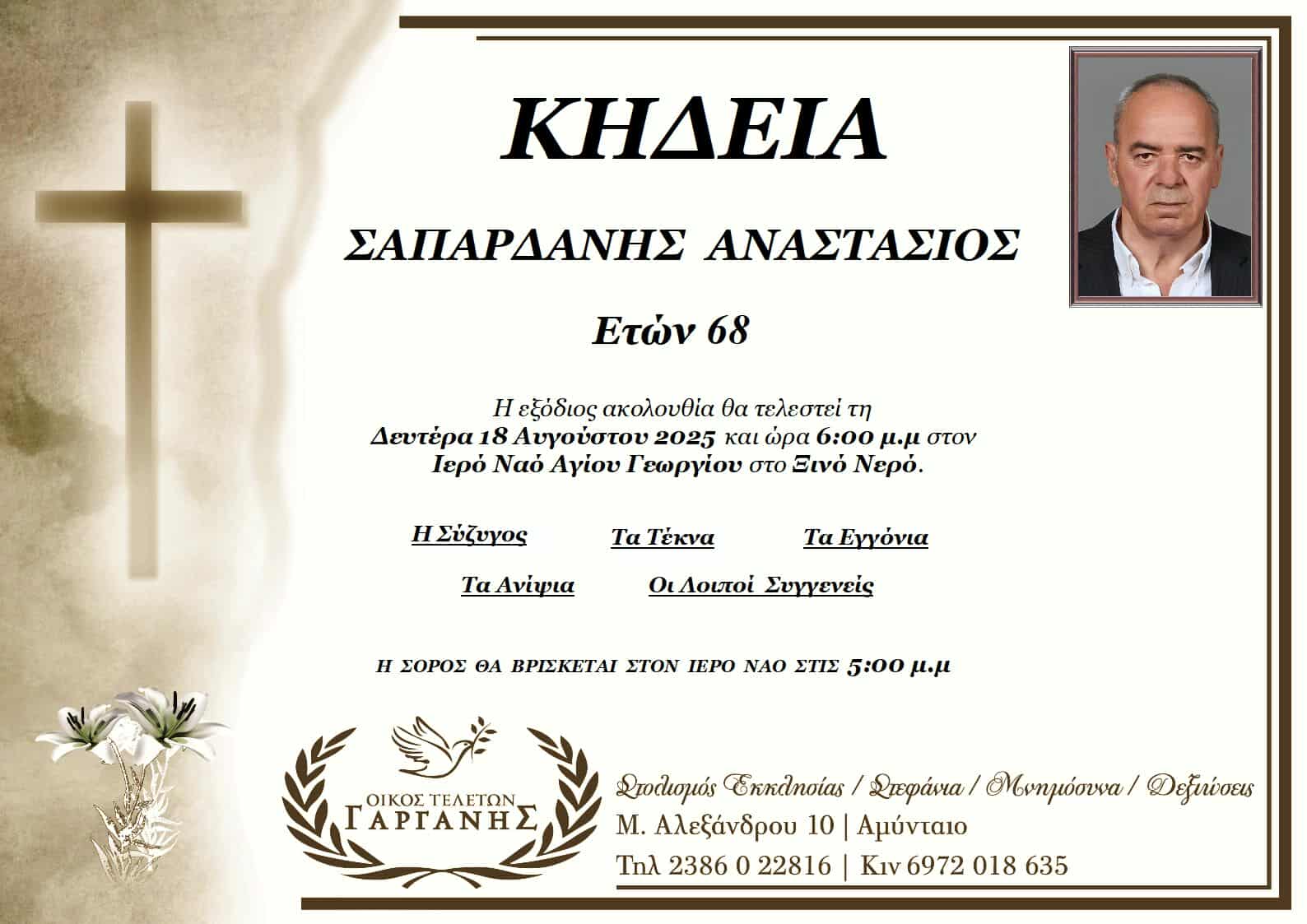 ΚοινωνικάΚηδεία του Αναστασίου Σαπαρδάνη, ετών 68 Κυριακή 17 Αυγούστου, 2025 19:02 florinapress.gr SHARE Ίσως να ενδιαφέρει ... Κηδεία της Βασιλικής Τσαμπάζη Κηδεία της Ειρήνης Τσαρτσιταλίδου, ετών 86 Κηδεία του Διομήδη Λαβασίδη, ετών 83 Κηδεία του Βασιλείου Δροσίνη Κηδεία της Ευδοκίας Μπούτλη, ετών 81 Share Ακολουθήστε μας8.4kFollowersLikeΤελευταία νέα Αγανακτισμένοι αγρότες : Ως εδώ, η κατάσταση δεν πάει άλλο Κοινωνία Πέμπτη 4 Δεκεμβρίου, 2025 Επισκέψεις Κινητών Μονάδων Υγείας σε απομακρυσμένες Κοινότητες του Δήμου Αμυνταίου Κοινωνία Πέμπτη 4 Δεκεμβρίου, 2025 Ευχαριστήρια επιστολή του Πειραματικού Σχολείου Φλώρινας προς το Κέντρο Περιβαλλοντικής Εκπαίδευσης & Αειφορίας Μελίτης Κοινωνία Πέμπτη 4 Δεκεμβρίου, 2025 Πωλείται Γερμανικός λέβητας ξύλου Κοινωνία Πέμπτη 4 Δεκεμβρίου, 2025