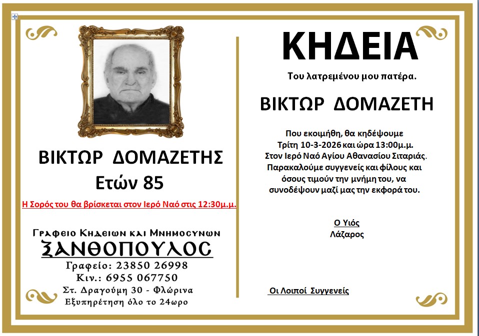 ΚοινωνικάΚηδεία του Βίκτωρα Δομαζέτη, ετών 85 Δευτέρα 9 Μαρτίου, 2026 10:56 florinapress.gr SHARE Ίσως να ενδιαφέρει ... Μνημόσυνα Σαββάτου 1 και Κυριακής 2 Ιουλίου Κηδεία του Αργυρίου Μπακάλη, ετών 55 Κηδεία της Ευδοκίας Χαριλάου Κηδεία του Ευάγγελου Παπαϊωάννου Κηδεία της Φρειδερίκης Ιωαννίδου, ετών 73 Share Ακολουθήστε μας8.4kFollowersLikeΤελευταία νέα Κηδεία της Ελευθερίας Ιωαννίδου, ετών 77 Κοινωνικά Δευτέρα 9 Μαρτίου, 2026 Στ. Παπασωτηρίου: Πρότυπο ψηφιακής οργάνωσης και ελέγχου το Νοσοκομείο Φλώρινας Πολιτική Δευτέρα 9 Μαρτίου, 2026 Ενημέρωση από τους γιατρούς του Ενιαίου Κοινωνικού Δικτύου Δυτικής Μακεδονίας στο Σχολείο Δεύτερης Ευκαιρίας Φλώρινας Κοινωνία Δευτέρα 9 Μαρτίου, 2026 Την Παγκόσμια ημέρα της Γυναίκας γιόρτασαν οι γυναίκες της Ιτιάς Κοινωνία Πολιτισμός Δευτέρα 9 Μαρτίου, 2026