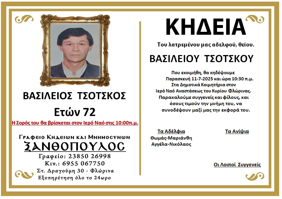 ΚοινωνικάΚηδεία του Βασίλη Τσότσκου ετών 72 Πέμπτη 10 Ιουλίου, 2025 11:42 florinapress.gr SHARE Ίσως να ενδιαφέρει ... Κηδεία της Αικατερίνης Νικολαϊδου – Κίζου Κηδεία του Αρχιμανδρίτη Κοσμά Λαμπρινού, ετών 57 Κηδεία του Δημοσθένη Θεοχαρίδη, ετών 105 Κηδεία του Βασιλείου Δροσίνη Κηδεία του Χρήστου Πετρίδη ετών 78 Share Ακολουθήστε μας8.4kFollowersLikeΤελευταία νέα Αγανακτισμένοι αγρότες : Ως εδώ, η κατάσταση δεν πάει άλλο Κοινωνία Πέμπτη 4 Δεκεμβρίου, 2025 Επισκέψεις Κινητών Μονάδων Υγείας σε απομακρυσμένες Κοινότητες του Δήμου Αμυνταίου Κοινωνία Πέμπτη 4 Δεκεμβρίου, 2025 Ευχαριστήρια επιστολή του Πειραματικού Σχολείου Φλώρινας προς το Κέντρο Περιβαλλοντικής Εκπαίδευσης & Αειφορίας Μελίτης Κοινωνία Πέμπτη 4 Δεκεμβρίου, 2025 Πωλείται Γερμανικός λέβητας ξύλου Κοινωνία Πέμπτη 4 Δεκεμβρίου, 2025
