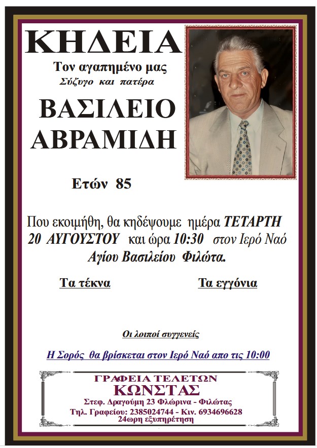 ΚοινωνικάΚηδεία του Βασιλείου Αβραμίδη, ετών 85 Τρίτη 19 Αυγούστου, 2025 13:12 florinapress.gr SHARE Ίσως να ενδιαφέρει ... Κηδεία του Νικολάου Αρβανίτη, ετών 92 Κηδεία του Γεωργίου Χρηστίδη, ετών 51 Ευχαριστήριο του Συνδέσμου Μοναστηριωτών και των Πέριξ εν Φλωρίνη «Η ΕΛΠΙΣ» Κηδεία της Σεβαστής Βράντση – Μπαρδάκα Κηδεία του Νικολάου Μιτσκίνη, ετών 68 Share Ακολουθήστε μας8.4kFollowersLikeΤελευταία νέα Την Τετάρτη 10 Δεκεμβρίου η φωταγώγηση του Χριστουγεννιάτικου Δέντρου στην κεντρική πλατεία της Φλώρινας Εκδηλώσεις Πολιτισμός Παρασκευή 5 Δεκεμβρίου, 2025 Χριστουγεννιάτικη συναυλία της Φιλαρμονικής Δήμου Φλώρινας Εκδηλώσεις Πολιτισμός Παρασκευή 5 Δεκεμβρίου, 2025 Η νέα σύνθεση της Δημοτικής Τοπικής Οργάνωσης (ΔΗΜΤΟ) Νέας Δημοκρατίας Αμυνταίου Πολιτική Παρασκευή 5 Δεκεμβρίου, 2025 Μήνυμα του Δημάρχου Φλώρινας για την Παγκόσμια Ημέρα Εθελοντισμού Κοινωνία Πολιτική Παρασκευή 5 Δεκεμβρίου, 2025