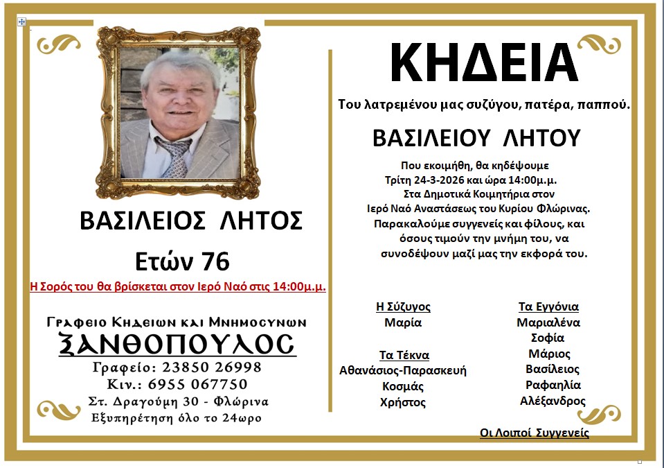 ΚοινωνικάΚηδεία του Βασιλείου Λήτου, ετών 76 Δευτέρα 23 Μαρτίου, 2026 12:45 florinapress.gr SHARE Ίσως να ενδιαφέρει ... Κηδεία της Κασσιανής Γώγου, ετών 89 Κηδεία της Αναστασίας Σαλαπάνη, ετών 88 Κηδεία της Όλγας Παπαγεωργίου, ετών 78 Κηδεία της Σταυρούλας Αντωνίου, ετών 81 Κηδεία της Άννας Σιάγκα, ετών 29 Share Ακολουθήστε μας8.4kFollowersLikeΤελευταία νέα Ο.ΞΙ.Φ.: 2ος ο Άγγελος, 3ος ο Βασίλης στην Παιανία – Χρυσό η Βαλέρια, 3η η Βίκυ στο Νόβι Σάντ! Αθλητισμός Δευτέρα 23 Μαρτίου, 2026 Ξανά μετάλλιο ο Εμμανουηλίδης Ραφαήλ του Α.Σ. Φοίνικα Φλώρινας στο πανελλήνιο κύπελλο στην Αθήνα Αθλητισμός Δευτέρα 23 Μαρτίου, 2026 Βραβεύσεις των μαθητών του Σκακιστικού Τμήματος της Λέσχης Πολιτισμού στο 18ο Σκακιστικό Ατομικό Μαθητικό Πρωτάθλημα ΕΣΣΚΕΔΥΜ Αθλητισμός Δευτέρα 23 Μαρτίου, 2026 Εκδήλωση επαγγελματικού προσανατολισμού από τον Δήμο Αμυνταίου Εκδηλώσεις Πολιτισμός Δευτέρα 23 Μαρτίου, 2026