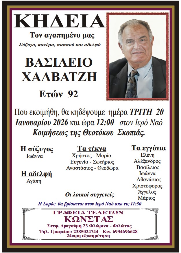 ΚοινωνικάΚηδεία του Βασιλείου Χαλβατζή, ετών 92 Δευτέρα 19 Ιανουαρίου, 2026 14:01 florinapress.gr SHARE Ίσως να ενδιαφέρει ... Κηδεία του Σωτηρίου Κωνσταντινίδη, ετών 88 Κηδεία του Ιωάννη Παπουτζή, ετών 84 Κηδεία του Δορυμέδωνα Μορφόπουλου, ετών 71 Κηδεία της Ανδρομάχης Κοκαροπούλου, ετών 89 Κηδεία της Ανθούλας Γιαννοπούλου, ετών 91 Share Ακολουθήστε μας8.4kFollowersLikeΤελευταία νέα Συγχαρητήριο μήνυμα Δημάρχου Αμυνταίου προς τον Αμυνταιώτη αθλητή Γιώργο Μπέικο Κοινωνία Πολιτική Δευτέρα 19 Ιανουαρίου, 2026 Ασημένιες και χάλκινες οι αθλήτριες του Α.Σ Φοίνικα Φλώρινας Φαρμακιώτη Βαΐα και Νικολαΐδου Στεφανία στο πανελλήνιο κύπελλο Ξίφους Μονομαχίας! Αθλητισμός Δευτέρα 19 Ιανουαρίου, 2026 Συγχαρητήριο του Συλλόγου – Συνδέσμου Αποστράτων Σωμάτων Ασφάλειας Νομού Φλώρινας Κοινωνία Δευτέρα 19 Ιανουαρίου, 2026 Κοπή βασιλόπιτας του Φυσιολατρικού Ορειβατικού Ομίλου Φλώρινας Εκδηλώσεις Πολιτισμός Δευτέρα 19 Ιανουαρίου, 2026