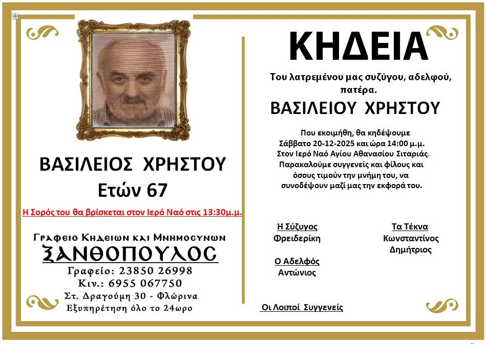ΚοινωνικάΚηδεία του Βασιλείου Χρήστου, ετών 67 Παρασκευή 19 Δεκεμβρίου, 2025 21:33 florinapress.gr SHARE Ίσως να ενδιαφέρει ... Κηδεία του Στέργιου Φίτζιου, ετών 73 Κηδεία του Σταύρου Μούτσια, ετών 91 Κηδεία της Αγάπης Πλαγιάντση, ετών 98 Ψήφισμα του Δικηγορικού Συλλόγου Φλώρινας Κηδεία της Αναστασίας Γιάγκου Share Ακολουθήστε μας8.4kFollowersLikeΤελευταία νέα Φωτιές με την Εύξεινο Λέσχη Φλώρινας Εκδηλώσεις Πολιτισμός Παρασκευή 19 Δεκεμβρίου, 2025 Συγχαρητήριο μήνυμα Δημάρχου Αμυνταίου για τις διακρίσεις του Θωμά Γκιουλέκα, στο Πανελλήνιο Πρωτάθλημα Άρσης Βαρών Πολιτική Πολιτισμός Παρασκευή 19 Δεκεμβρίου, 2025 Ευχές από την Εύξεινο Λέσχη Φλώρινας Κοινωνία Πολιτισμός Παρασκευή 19 Δεκεμβρίου, 2025 Σταύρος Παπασωτηρίου: «Ταχύρρυθμο πρόγραμμα ξεναγών, σε συνεργασία με το Πανεπιστήμιο Μακεδονίας, στη Φλώρινα» Πολιτική Παρασκευή 19 Δεκεμβρίου, 2025