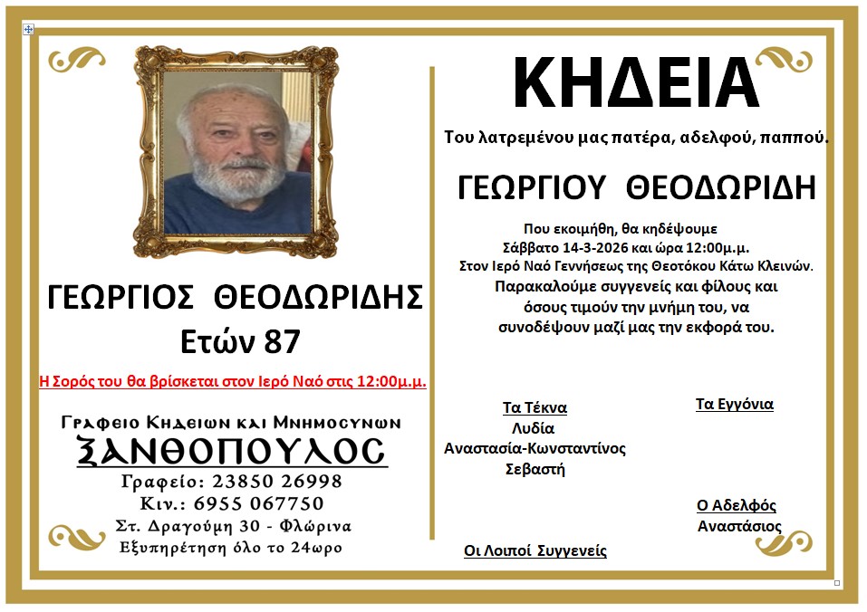 ΚοινωνικάΚηδεία του Γεωργίου Θεοδωρίδη, ετών 87 Παρασκευή 13 Μαρτίου, 2026 13:41 florinapress.gr SHARE Ίσως να ενδιαφέρει ... Ευχαριστήριο του Αθανασίου Παλιογιάννη Κηδεία του Νικολάου Δούμτση Κηδεία του Ευάγγελου Γαζέα, ετών 90 Κηδεία της Παρασκευής Μιμιλίδου Ευχαριστήριο του Πέτρου Κωσταρέλλη Share Ακολουθήστε μας8.4kFollowersLikeΤελευταία νέα Παρουσίαση του βιβλίου Θυμάμαι…Στο Αμύνταιο από το 1953 & ορεινές περιηγήσεις του Θανάση Τραϊανού Εκδηλώσεις Πολιτισμός Παρασκευή 13 Μαρτίου, 2026 Αναλυτικά τα δρομολόγια των Κινητών Αστυνομικών Μονάδων για την επόμενη εβδομάδα Κοινωνία Παρασκευή 13 Μαρτίου, 2026 Κηδεία της Βασιλικής Μαύρου, ετών 95 Κοινωνικά Παρασκευή 13 Μαρτίου, 2026 Στ. Παπασωτηρίου: «H Ελλάδα στο κατώφλι μιας ιστορικής ενεργειακής καμπής» Πολιτική Παρασκευή 13 Μαρτίου, 2026