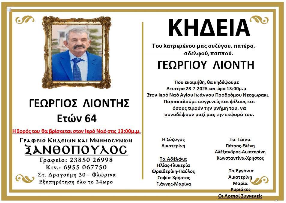 ΚοινωνικάΚηδεία του Γεωργίου Λιόντη, ετών 64 Κυριακή 27 Ιουλίου, 2025 22:43 florinapress.gr SHARE Ίσως να ενδιαφέρει ... Κηδεία του Κωνσταντίνου Δαμιανίδη, ετών 72 Κηδεία του Χρήστου Ονουφριάδη ετών 84 Μνημόσυνα Σαββάτου 29 Μαΐου Κηδεία της Μαρίας Βακάλη Μνημόσυνα Σαββάτου 7 και Κυριακής 8 Ιανουαρίου 2023 Share Ακολουθήστε μας8.4kFollowersLikeΤελευταία νέα Αγανακτισμένοι αγρότες : Ως εδώ, η κατάσταση δεν πάει άλλο Κοινωνία Πέμπτη 4 Δεκεμβρίου, 2025 Επισκέψεις Κινητών Μονάδων Υγείας σε απομακρυσμένες Κοινότητες του Δήμου Αμυνταίου Κοινωνία Πέμπτη 4 Δεκεμβρίου, 2025 Ευχαριστήρια επιστολή του Πειραματικού Σχολείου Φλώρινας προς το Κέντρο Περιβαλλοντικής Εκπαίδευσης & Αειφορίας Μελίτης Κοινωνία Πέμπτη 4 Δεκεμβρίου, 2025 Πωλείται Γερμανικός λέβητας ξύλου Κοινωνία Πέμπτη 4 Δεκεμβρίου, 2025