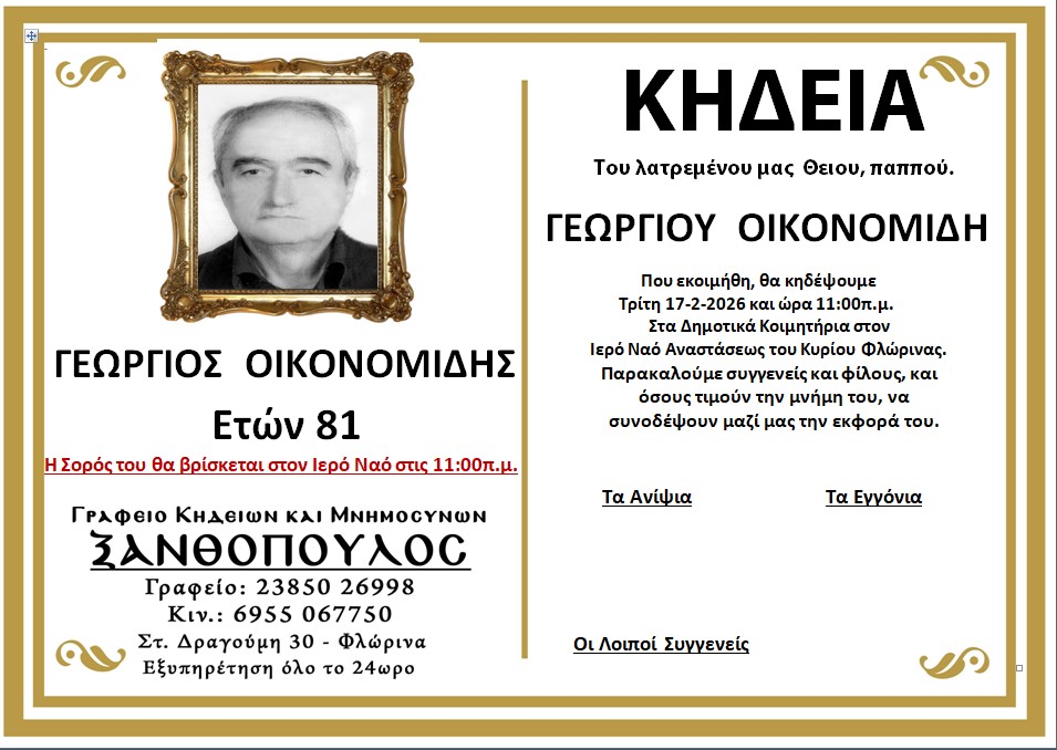ΚοινωνικάΚηδεία του Γεωργίου Οικονομίδη, ετών 81 Δευτέρα 16 Φεβρουαρίου, 2026 12:11 florinapress.gr SHARE Ίσως να ενδιαφέρει ... Κηδεία του Μόσχου Κιοσέ, ετών 62 Κηδεία του Πέτρου Δελκούση, ετών 73 Κηδεία του Στέφανου Δροσίνη, ετών 83 Κηδεία της Ειρήνης Γρηγοριάδου, ετών 69 Δωρεά στο Κέντρο Κοινωνικής Πρόνοιας Περιφέρειας Δυτικής Μακεδονίας Share Ακολουθήστε μας8.4kFollowersLikeΤελευταία νέα Ευχαριστήριο του 1ου ΓΕΛ Φλώρινας Κοινωνία Δευτέρα 16 Φεβρουαρίου, 2026 Εκπαιδευτική επίσκεψη του 1ου ΓΕΛ Φλώρινας στα Γενικά Αρχεία του Κράτους Κοινωνία Δευτέρα 16 Φεβρουαρίου, 2026 Μεταφορά ημέρας διενέργειας λαϊκής αγοράς ημέρας Δευτέρας 23 Φεβρουαρίου του Δήμου Αμυνταίου λόγω αργίας Κοινωνία Δευτέρα 16 Φεβρουαρίου, 2026 Επίσκεψη του Ειδικού Δημοτικού Σχολείου στο ΚΗΦΗ Φλώρινας Κοινωνία Δευτέρα 16 Φεβρουαρίου, 2026