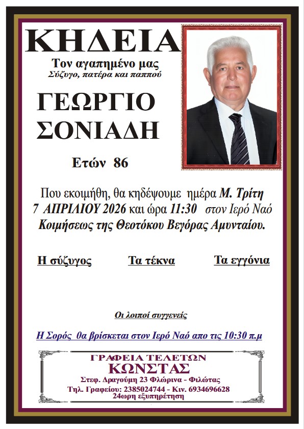 ΚοινωνικάΚηδεία του Γεωργίου Σονιάδη, ετών 86 Δευτέρα 6 Απριλίου, 2026 20:13 florinapress.gr SHARE Ίσως να ενδιαφέρει ... Πένθιμο αγγελτήριο: Κηδεία του Ηρακλή Μιτσκίνη Κηδεία της Φλώρας Ανδρέου Κηδεία της Ελένης Ταβελάρη, ετών 100 Κηδεία του Μανώλη Γιοφτσίδη, ετών 83 Κηδεία της Ζωίτσας Καρρά, ετών 74 Share Ακολουθήστε μας8.4kFollowersLikeΤελευταία νέα Απαγόρευση αλιείας στην Π.Ε. Φλώρινας Κοινωνία Δευτέρα 6 Απριλίου, 2026 Πέτη Πέρκα από το βήμα της Βουλής: Δεν μιλάμε για «παθογένειες», αλλά μιλάμε για καθεστώς και για ανεξέλεγκτη εξουσία Πολιτική Δευτέρα 6 Απριλίου, 2026 Μεταφορά ημέρας διενέργειας λαϊκής αγοράς Αμυνταίου λόγω αργίας Κοινωνία Δευτέρα 6 Απριλίου, 2026 Εθιμοτυπική συνάντηση του Δημάρχου Πρεσπών με τον Αστυνομικό Διευθυντή Φλώρινας Πολιτική Δευτέρα 6 Απριλίου, 2026