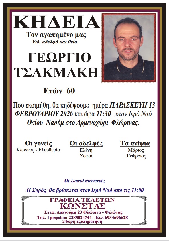 ΚοινωνικάΚηδεία του Γεωργίου Τσακμάκη, ετών 60 Πέμπτη 12 Φεβρουαρίου, 2026 12:01 florinapress.gr SHARE Ίσως να ενδιαφέρει ... Συλλυπητήριο μήνυμα του Δ.Σ. του Φ.Σ.Φ. «Ο Αριστοτέλης» Κηδεία του Σπύρου Διακόπουλου ετών 66 Κηδεία του Αρχόντη Ιωαννίδη, ετών 70 Ευχαριστήριο μήνυμα του Πειραματικού Δημοτικού Σχολείου Φλώρινας Κηδεία του Στέργιου Σαπουντζή, ετών 76 Share Ακολουθήστε μας8.4kFollowersLikeΤελευταία νέα Συγχαρητήρια επιστολή του Βουλευτή Στ. Παπασωτηρίου για τις διακρίσεις της Φλώρινας στα Best City Awards 2026 Πολιτική Πολιτισμός Πέμπτη 12 Φεβρουαρίου, 2026 Διακοπή ηλεκτροδότησης στις Τ.Κ Αχλάδας και Σκοπού του Δήμου Φλώρινας Κοινωνία Πέμπτη 12 Φεβρουαρίου, 2026 Χάντμπολ: Όλοι μια γροθιά στον αγώνα του Αμύντα Αμυνταίου απέναντι στην Πυλαία Αθλητισμός Πέμπτη 12 Φεβρουαρίου, 2026 Όταν η αντιπολίτευση γίνεται θόρυβος, η αλήθεια γίνεται υποχρέωση Πολιτική Πέμπτη 12 Φεβρουαρίου, 2026