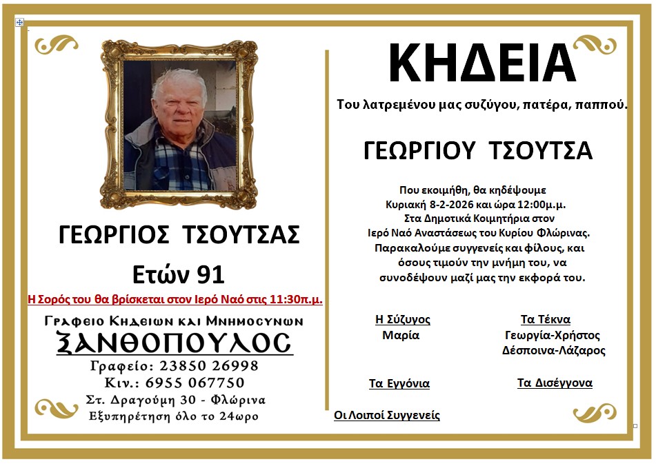 ΚοινωνικάΚηδεία του Γεωργίου Τσούτσα, ετών 91 Σάββατο 7 Φεβρουαρίου, 2026 12:04 florinapress.gr SHARE Ίσως να ενδιαφέρει ... Κηδεία της Ευαγγελίας Ασλάκη-Σταμπουλτζή ετών 60 Κηδεία του Παντελή Βλάχου ετών 39 Κηδεία του Χρήστου Λιανού, ετών 86 Κηδεία της Άλκιστης Πασσαλίδου, ετών 72 Κηδεία της Ευγενίας Βελλιάνη, ετών 85 Share Ακολουθήστε μας8.4kFollowersLikeΤελευταία νέα Πραγματοποιήθηκαν ενημερωτικές διαλέξεις με σκοπό τον συντονισμό των ελεγκτικών μηχανισμών, για την αντιμετώπιση της ευλογιάς των αιγοπροβάτων Κοινωνία Σάββατο 7 Φεβρουαρίου, 2026 Συγχαρητήριο μήνυμα του Δημάρχου Φλώρινας προς το Εσπερινό ΕΠΑΛ Φλώρινας Κοινωνία Σάββατο 7 Φεβρουαρίου, 2026 Στις επιλογές της Εθνικής Κ14 οι Γιώσης και Σολάκης του ΠΑΣ Φλώρινα Αθλητισμός Σάββατο 7 Φεβρουαρίου, 2026 Κοπή βασιλόπιτας στις Σάρισες Αθλητισμός Σάββατο 7 Φεβρουαρίου, 2026