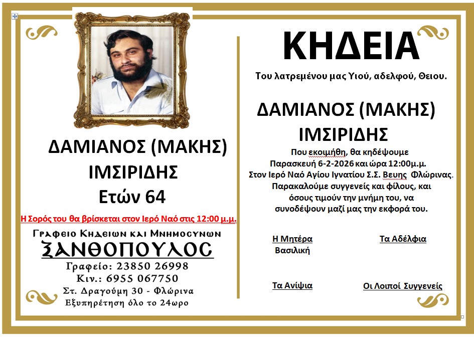 ΚοινωνικάΚηδεία του Δαμιανού (Μάκη) Ιμσιρίδη, ετών 64 Πέμπτη 5 Φεβρουαρίου, 2026 12:13 florinapress.gr SHARE Ίσως να ενδιαφέρει ... Κηδεία της Αθηνάς Κοϊμτσίδου, ετών 67 Κηδεία της Γιαννούλας Τρυφωνίδου, ετών 87 Κηδεία του Παύλου Σταθόπουλου, ετών 89 Κηδεία της Αναστασίας Κληντσάρη, ετών 87 Ευχαριστήριο μήνυμα του Αγροτικού Συλλόγου Δήμου Αμυνταίου Share Ακολουθήστε μας8.4kFollowersLikeΤελευταία νέα Σχολιασμός της επιτροπής αγώνα κατοίκων Αχλάδας σχετικά με καταγγελία του Κοινοτάρχη Κοινωνία Πέμπτη 5 Φεβρουαρίου, 2026 Κοπή βασιλόπιτας του Συλλόγου Εκπαιδευτικών Π.Ε. Ν. Φλώρινας Εκδηλώσεις Πολιτισμός Πέμπτη 5 Φεβρουαρίου, 2026 Κηδεία του Θεόδωρου Σαχινίδη, ετών 78 Κοινωνικά Τετάρτη 4 Φεβρουαρίου, 2026 Η Νεφέλη Τίτα στους Χειμερινούς Ολυμπιακούς Αγώνες «Milano-Cortina 2026» – ομοσπονδιακός προπονητής ο Χρήστος Τίτας Αθλητισμός Κοινωνία Τετάρτη 4 Φεβρουαρίου, 2026