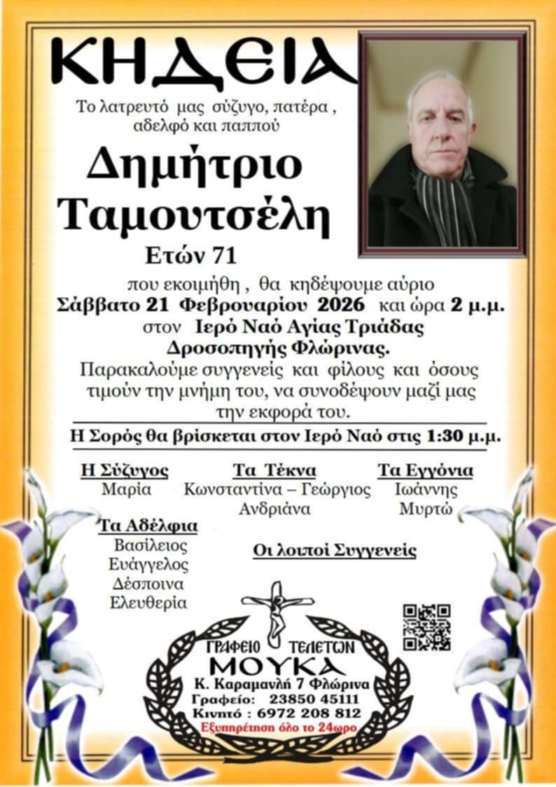 ΚοινωνικάΚηδεία του Δημητρίου Ταμουτσέλη, ετών 71 Παρασκευή 20 Φεβρουαρίου, 2026 12:15 florinapress.gr SHARE Ίσως να ενδιαφέρει ... Κηδεία του Τρύφωνος Στρεμπένη, ετών 56 Συλλυπητήριο ψήφισμα του Συλλόγου Εκπαιδευτικών Π.Ε. Φλώρινας Κηδεία του Τραΐανού Πετκάνη, ετών 69 Κηδεία του Θεόδωρου Τσουτσούλη, ετών 90 Κηδεία του Χρήστου Θώμου, ετών 88 Share Ακολουθήστε μας8.4kFollowersLikeΤελευταία νέα Θέμα της βραδιάς ποίησης από τη Στέγη Γραμμάτων και Τεχνών Αμυνταίου Κοινωνία Πολιτισμός Παρασκευή 20 Φεβρουαρίου, 2026 Ειδική και τακτική συνεδρίαση του Δημοτικού Συμβουλίου Φλώρινας Πολιτική Παρασκευή 20 Φεβρουαρίου, 2026 Πωλείται μονοκατοικία στη Φλώρινα Κοινωνία Παρασκευή 20 Φεβρουαρίου, 2026 Οι Διαιτητές των Αγώνων Α’ Κατηγορίας ΕΠΣ Φλώρινας 21, 22 & 25/2/2026 Αθλητισμός Παρασκευή 20 Φεβρουαρίου, 2026