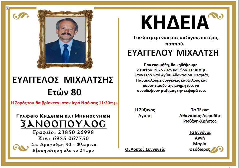 ΚοινωνικάΚηδεία του Ευάγγελου Μιχάλτση, ετών 80 Κυριακή 27 Ιουλίου, 2025 22:49 florinapress.gr SHARE Ίσως να ενδιαφέρει ... Κηδεία της Τραϊανής Μακρή, ετών 90 Κηδεία της Μαρίας Τσομπανοπούλου, ετών 64 Κηδεία του Απόστολου Ιωαννίδη ετών 51 Κηδεία του Γεωργίου Σταμπάνη, ετών 71 Κηδεία της Φωτεινής χήρας Ιωάννου Μαντρατζή Share Ακολουθήστε μας8.4kFollowersLikeΤελευταία νέα Αγανακτισμένοι αγρότες : Ως εδώ, η κατάσταση δεν πάει άλλο Κοινωνία Πέμπτη 4 Δεκεμβρίου, 2025 Επισκέψεις Κινητών Μονάδων Υγείας σε απομακρυσμένες Κοινότητες του Δήμου Αμυνταίου Κοινωνία Πέμπτη 4 Δεκεμβρίου, 2025 Ευχαριστήρια επιστολή του Πειραματικού Σχολείου Φλώρινας προς το Κέντρο Περιβαλλοντικής Εκπαίδευσης & Αειφορίας Μελίτης Κοινωνία Πέμπτη 4 Δεκεμβρίου, 2025 Πωλείται Γερμανικός λέβητας ξύλου Κοινωνία Πέμπτη 4 Δεκεμβρίου, 2025