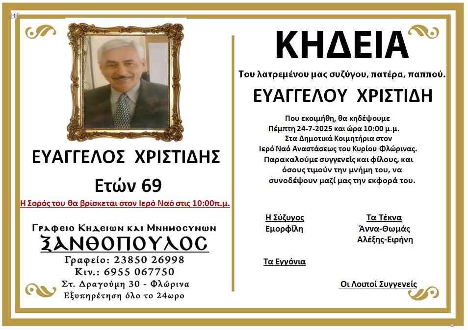 ΚοινωνικάΚηδεία του Ευάγγελου Χριστίδη ετών 69 Τετάρτη 23 Ιουλίου, 2025 10:47 florinapress.gr SHARE Ίσως να ενδιαφέρει ... Συνελήφθη 38χρονος αλλοδαπός στη Φλώρινα Συνελήφθη 48χρονη αλλοδαπή σε περιοχή της Φλώρινας για απόφαση Δικαστηρίου Κλειστά θα παραμείνουν τα σχολεία του Δήμου Φλώρινας την Δευτέρα 22 Ιανουαρίου Κηδεία της Ευγενίας Παπασωτηρίου ετών 89 40ήμερο μνημόσυνο της Αγάπης Τάχου Share Ακολουθήστε μας8.4kFollowersLikeΤελευταία νέα Σ. Βόσδου: η συνέντευξη των Αμανατίδη-Τάσκα αγγίζει τα όρια της συκοφαντίας – Χ. Μπαρδάκας: η δική μας κριτική ασκείται με όρους σοβαρότητας και συνοδεύεται από προτάσεις Πολιτική Κυριακή 14 Δεκεμβρίου, 2025 Η Πέτη Πέρκα στη Βουλή: Προϋπολογισμός βγαλμένος από άλλη δεκαετία, σαν να μην υπάρχει κλιματική κρίση – Ο πλανήτης δεν αντέχει άλλη αναβολή Πολιτική Κυριακή 14 Δεκεμβρίου, 2025 Χριστουγεννιάτικη Γιορτή της ΣΚΑΕΠ του Πανεπιστημίου Δυτικής Μακεδονίας Εκδηλώσεις Πολιτισμός Κυριακή 14 Δεκεμβρίου, 2025 Εγκύκλιος Εράνου Αγάπης (Κυριακή 14 Δεκεμβρίου 2025) Κοινωνία Κυριακή 14 Δεκεμβρίου, 2025