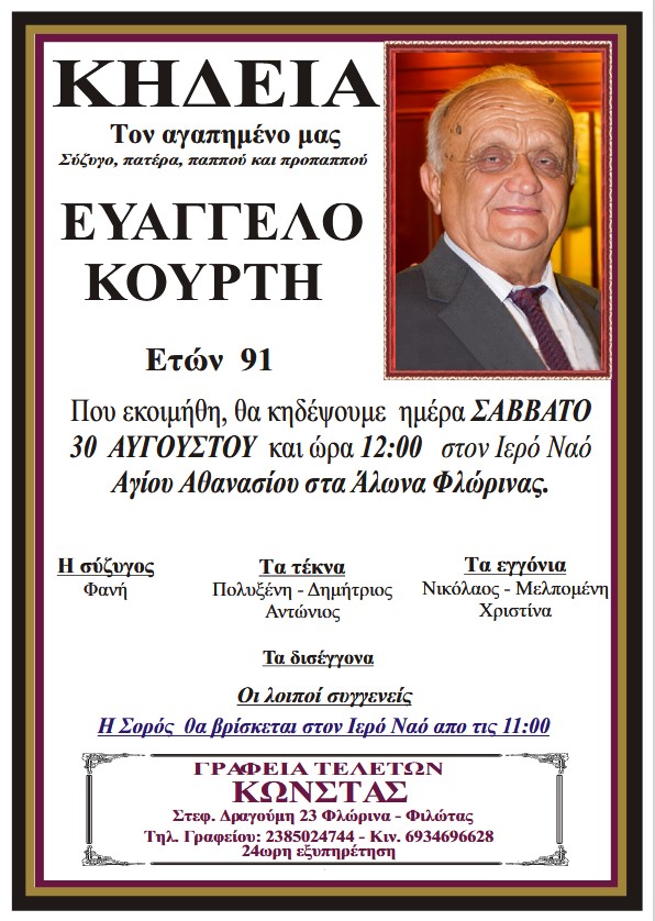 ΚοινωνικάΚηδεία του Ευαγγέλου Κούρτη, ετών 91 Παρασκευή 29 Αυγούστου, 2025 20:35 florinapress.gr SHARE Ίσως να ενδιαφέρει ... Ευχαριστήριο μήνυμα για το χριστουγεννιάτικο μπαζάρ Συγχαρητήριο της Γυμναστική Ένωση Φλώρινας Κηδεία του Κωνσταντίνου Τσελίκα, ετών 92 Μνημόσυνα Σαββάτου 18 και Κυριακής 19 Δεκεμβρίου Κηδεία του Ευάγγελου Μίσκα ετών 88 Share Ακολουθήστε μας8.4kFollowersLikeΤελευταία νέα Αγανακτισμένοι αγρότες : Ως εδώ, η κατάσταση δεν πάει άλλο Κοινωνία Πέμπτη 4 Δεκεμβρίου, 2025 Επισκέψεις Κινητών Μονάδων Υγείας σε απομακρυσμένες Κοινότητες του Δήμου Αμυνταίου Κοινωνία Πέμπτη 4 Δεκεμβρίου, 2025 Ευχαριστήρια επιστολή του Πειραματικού Σχολείου Φλώρινας προς το Κέντρο Περιβαλλοντικής Εκπαίδευσης & Αειφορίας Μελίτης Κοινωνία Πέμπτη 4 Δεκεμβρίου, 2025 Πωλείται Γερμανικός λέβητας ξύλου Κοινωνία Πέμπτη 4 Δεκεμβρίου, 2025
