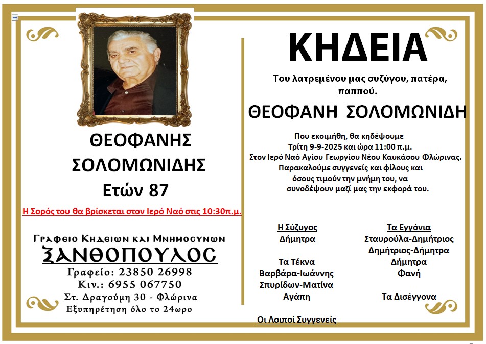 ΚοινωνικάΚηδεία του Θεοφάνη Σολομωνίδη, ετών 87 Δευτέρα 8 Σεπτεμβρίου, 2025 14:16 florinapress.gr SHARE Ίσως να ενδιαφέρει ... Κηδεία της Ειρήνης Γρηγοριάδου, ετών 69 Κηδεία Ελένης Λιακούση, ετών 89 Συγχαρητήρια Επιστολή του Γιάννη Βοσκόπουλου στον Τάσο Χατζηχρήστο Κηδεία του Γιαννόπουλου Γεωργίου Ταξίαρχου εε Κηδεία της Μαρίας Τσίκου, ετών 87 Share Ακολουθήστε μας8.4kFollowersLikeΤελευταία νέα Αγανακτισμένοι αγρότες : Ως εδώ, η κατάσταση δεν πάει άλλο Κοινωνία Πέμπτη 4 Δεκεμβρίου, 2025 Επισκέψεις Κινητών Μονάδων Υγείας σε απομακρυσμένες Κοινότητες του Δήμου Αμυνταίου Κοινωνία Πέμπτη 4 Δεκεμβρίου, 2025 Ευχαριστήρια επιστολή του Πειραματικού Σχολείου Φλώρινας προς το Κέντρο Περιβαλλοντικής Εκπαίδευσης & Αειφορίας Μελίτης Κοινωνία Πέμπτη 4 Δεκεμβρίου, 2025 Πωλείται Γερμανικός λέβητας ξύλου Κοινωνία Πέμπτη 4 Δεκεμβρίου, 2025