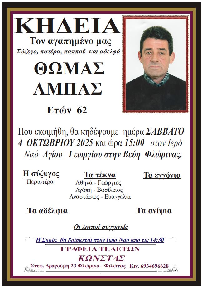 ΚοινωνικάΚηδεία του Θωμά Άμπα ετών 62 Παρασκευή 3 Οκτωβρίου, 2025 10:31 florinapress.gr SHARE Ίσως να ενδιαφέρει ... Κηδεία της Τραϊανής Κώτσιου, ετών 87 Κηδεία της Αιμηλίας Τάντση, ετών 98 Κηδεία της Μαρίας Γεωργίου, ετών 95 Ευχαριστήριο Δωρεάς προς την Ένωση Φωτογράφων Κ-Δ. Μακεδονίας Κηδεία του Δημητρίου Γιοφτσίδη, ετών 48 Share Ακολουθήστε μας8.4kFollowersLikeΤελευταία νέα Αγανακτισμένοι αγρότες : Ως εδώ, η κατάσταση δεν πάει άλλο Κοινωνία Πέμπτη 4 Δεκεμβρίου, 2025 Επισκέψεις Κινητών Μονάδων Υγείας σε απομακρυσμένες Κοινότητες του Δήμου Αμυνταίου Κοινωνία Πέμπτη 4 Δεκεμβρίου, 2025 Ευχαριστήρια επιστολή του Πειραματικού Σχολείου Φλώρινας προς το Κέντρο Περιβαλλοντικής Εκπαίδευσης & Αειφορίας Μελίτης Κοινωνία Πέμπτη 4 Δεκεμβρίου, 2025 Πωλείται Γερμανικός λέβητας ξύλου Κοινωνία Πέμπτη 4 Δεκεμβρίου, 2025