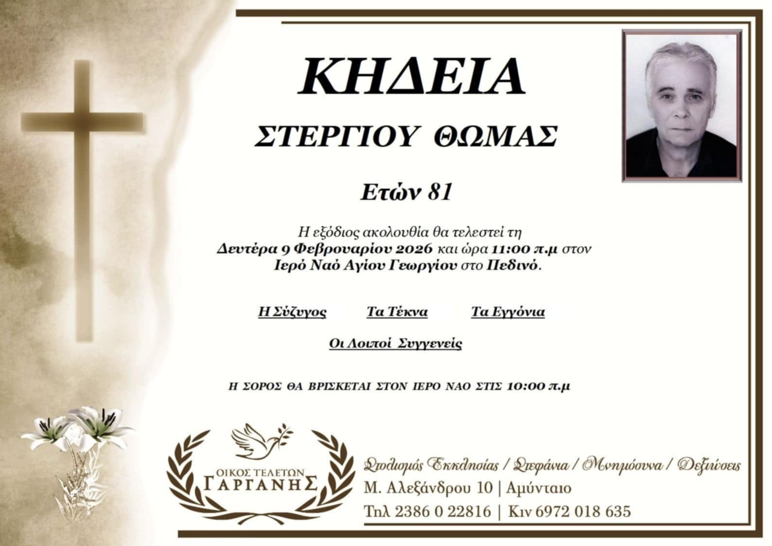 ΚοινωνικάΚηδεία του Θωμά Στεργίου, ετών 81 Κυριακή 8 Φεβρουαρίου, 2026 19:57 florinapress.gr SHARE Ίσως να ενδιαφέρει ... Συλλυπητήριο μήνυμα του Συνδέσμου Εργολάβων – Ηλεκτρολόγων Φλώρινας Κηδεία της Ασπασίας Άμπα Κηδεία του Παντελή Μπιμπάση Κηδεία του Χρήστου Τερεζή Κηδεία της Σοφίας Δούμπαλη, ετών 85 Share Ακολουθήστε μας8.4kFollowersLikeΤελευταία νέα Κοπή βασιλόπιτας του Αστυνομικού τμήματος Βεύης Πολιτισμός Κυριακή 8 Φεβρουαρίου, 2026 Πέτη Πέρκα: Η Νεφέλη Τίτα έγραψε ιστορία – Υπερηφάνεια για τη Φλώρινα και τον ελληνικό αθλητισμό! Κοινωνία Πολιτική Κυριακή 8 Φεβρουαρίου, 2026 Κηδεία του Παρίση Συπιδία, ετών 92 Κοινωνικά Κυριακή 8 Φεβρουαρίου, 2026 Ο Γρηγόρης Δημητριάδης στην κοπή πίτας της ΝΔ Θεσσαλονίκης (video & photos) Πολιτική Κυριακή 8 Φεβρουαρίου, 2026
