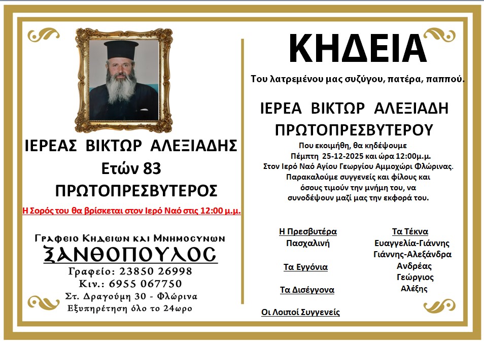 ΚοινωνικάΚηδεία του Ιερέα Βίκτωρα Αλεξιάδη, ετών 83 Τετάρτη 24 Δεκεμβρίου, 2025 14:16 florinapress.gr SHARE Ίσως να ενδιαφέρει ... Τεσσαρακονθήμερο μνημόσυνο του Νικολάου Δόντσου Ευχαριστήριο του Πειραματικού Σχολείου Φλώρινας Κηδεία του Ηλία Άλτα Κηδεία Ιορδάνη Λαζαρίδη Κηδεία της Σταυρίδου Ζωής, ετών 79 Share Ακολουθήστε μας8.4kFollowersLikeΤελευταία νέα Φλώρινα: φωτιές 2025 Κοινωνία Τετάρτη 24 Δεκεμβρίου, 2025 Κηδεία του Αλέξανδρου Βδελίδη, ετών 88 Κοινωνικά Τετάρτη 24 Δεκεμβρίου, 2025 Ευχές του Συλλόγου Γονέων και Κηδεμόνων του Γυμνασίου Μελίτης Κοινωνία Τετάρτη 24 Δεκεμβρίου, 2025 Χριστουγεννιάτικα κάλαντα και ευχές στον Δήμαρχο Φλώρινας Κοινωνία Πολιτισμός Τετάρτη 24 Δεκεμβρίου, 2025