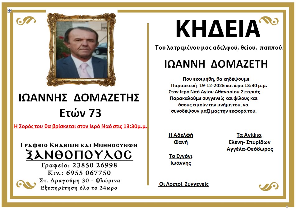 ΚοινωνικάΚηδεία του Ιωάννη Δομαζέτη, ετών 73 Πέμπτη 18 Δεκεμβρίου, 2025 20:14 florinapress.gr SHARE Ίσως να ενδιαφέρει ... Κηδεία του Παύλου Κοϊτσόπουλου Κηδεία του Σταύρου Παρίση, ετών 94 Κηδεία του Νικολάου Μαλεζίδη Κηδεία της Καλυψούς Πέτρου, ετών 67 Κηδεία του Περικλή Ματσκαλίδη Share Ακολουθήστε μας8.4kFollowersLikeΤελευταία νέα Επίσκεψη του Αντιπεριφερειάρχη Φλώρινας Αθανάσιου Τάσκα στις Πρέσπες στο πλαίσιο των εορτών των Χριστουγέννων και της Πρωτοχρονιάς Πολιτική Πέμπτη 18 Δεκεμβρίου, 2025 Με την “Γιορτή Ζαχαρωτών” συνεχίστηκαν οι Χριστουγεννιάτικες εκδηλώσεις του Δήμου Φλώρινας Εκδηλώσεις Πολιτισμός Πέμπτη 18 Δεκεμβρίου, 2025 Θέση εργασίας στη Φλώρινα Κοινωνία Πέμπτη 18 Δεκεμβρίου, 2025 Χριστουγεννιάτικη εκδήλωση για τα παιδιά του Δήμου Αμυνταίου Εκδηλώσεις Πολιτισμός Πέμπτη 18 Δεκεμβρίου, 2025