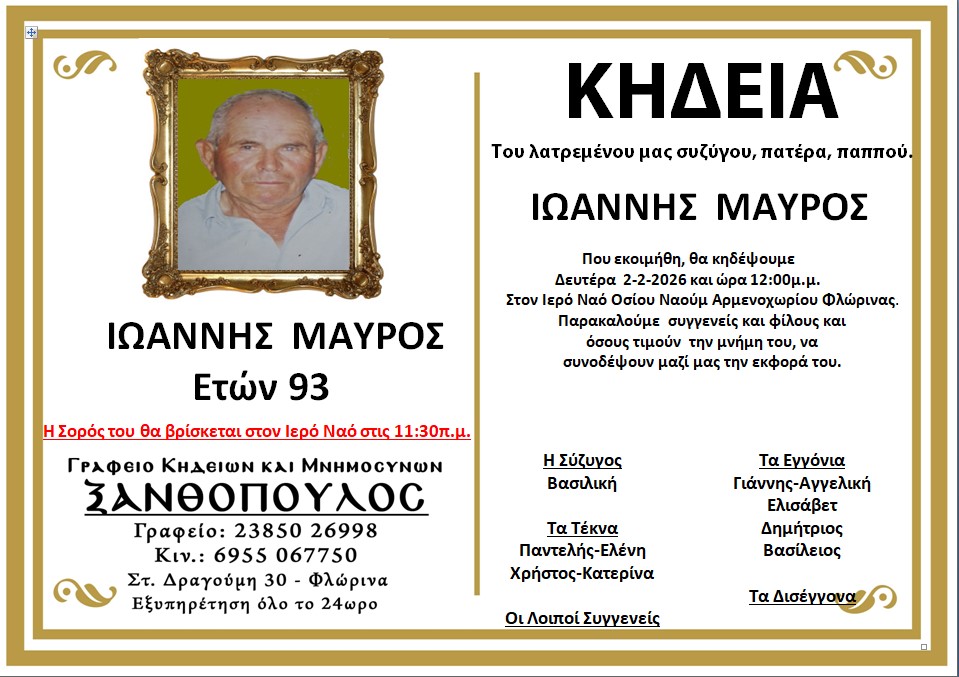 ΚοινωνικάΚηδεία του Ιωάννη Μαύρου, ετών 93 Κυριακή 1 Φεβρουαρίου, 2026 12:58 florinapress.gr SHARE Ίσως να ενδιαφέρει ... Κηδεία του Στυλιανού Λιθοξοϊδη στών 91 Κηδεία του Νικολάου Δίνη Κηδεία του Χρήστου Παπαδόπουλου, ετών 97 Κηδεία της Ερμιόνης Μίχτη, ετών 93 Κηδεία της Φανής Τουρούντζη, ετών 98 Share Ακολουθήστε μας8.4kFollowersLikeΤελευταία νέα Συλλυπητήριο μήνυμα του Συλλόγου Διδασκόντων του Μουσικού Σχολείου Αμυνταίου Κοινωνία Κυριακή 1 Φεβρουαρίου, 2026 Ευχαριστήριο στο Νοσοκομείο Φλώρινας Κοινωνία Κυριακή 1 Φεβρουαρίου, 2026 Συλλυπητήριο μήνυμα του Συλλόγου Γονέων και Κηδεμόνων του 8ου Νηπιαγωγείου Φλώρινας Κοινωνία Κυριακή 1 Φεβρουαρίου, 2026 Κηδεία της Ολυμπίας Ραντζάκη, ετών 65 Κοινωνικά Κυριακή 1 Φεβρουαρίου, 2026