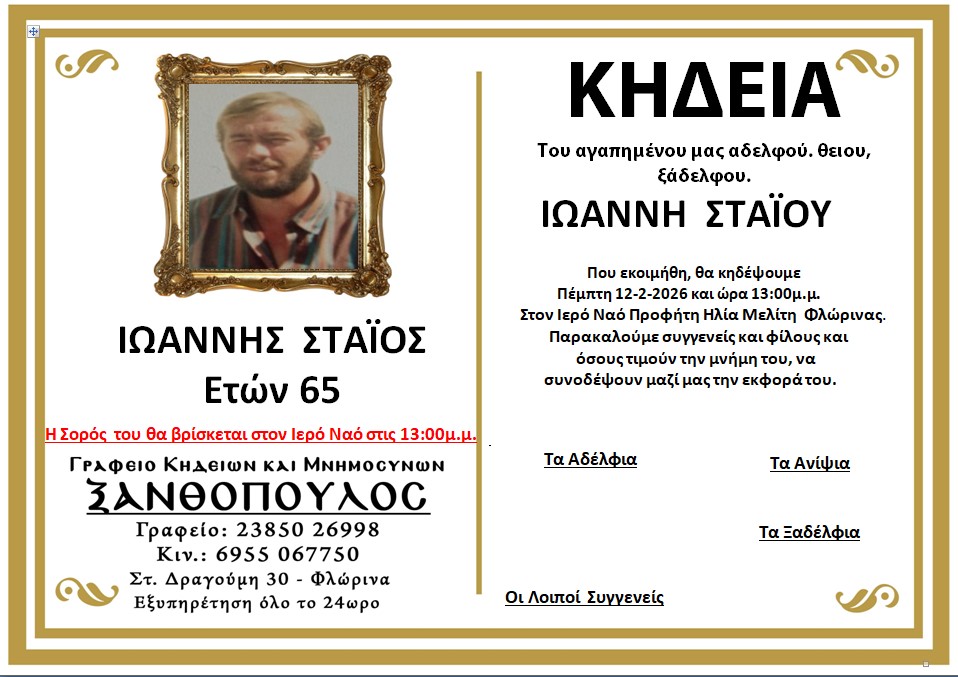 ΚοινωνικάΚηδεία του Ιωάννη Στάιου, ετών 65 Τετάρτη 11 Φεβρουαρίου, 2026 19:59 florinapress.gr SHARE Ίσως να ενδιαφέρει ... Κηδεία του Ιωάννη Παγανού, ετών 66 Ευχαριστήρια επιστολή του προέδρου της Τοπικής Κοινότητας Αχλάδας Κηδεία της Φωτεινής Γιαννώτα Κηδεία του Σπυρίδωνα Σιάλτση, ετών 81 Ευχαριστήριο του Συνδέσμου Μοναστηριωτών και των Πέριξ εν Φλωρίνη «Η ΕΛΠΙΣ» Share Ακολουθήστε μας8.4kFollowersLikeΤελευταία νέα Κηδεία του Αιμίλιου Δημητριάδη, ετών 68 Κοινωνικά Τετάρτη 11 Φεβρουαρίου, 2026 19 νέες δίκυκλες μοτοσικλέτες σε Υπηρεσίες της Δυτικής Μακεδονίας Κοινωνία Τετάρτη 11 Φεβρουαρίου, 2026 Αναβολή Αγώνων ΕΠΣ Φλώρινας μέχρι νεωτέρας Αθλητισμός Τετάρτη 11 Φεβρουαρίου, 2026 Οι αποφάσεις του Δημοτικού Συμβουλίου δεν είναι προτάσεις. Είναι νόμος. Στον Δήμο Αμυνταίου η νομιμότητα δεν είναι προαιρετική. Πολιτική Τετάρτη 11 Φεβρουαρίου, 2026