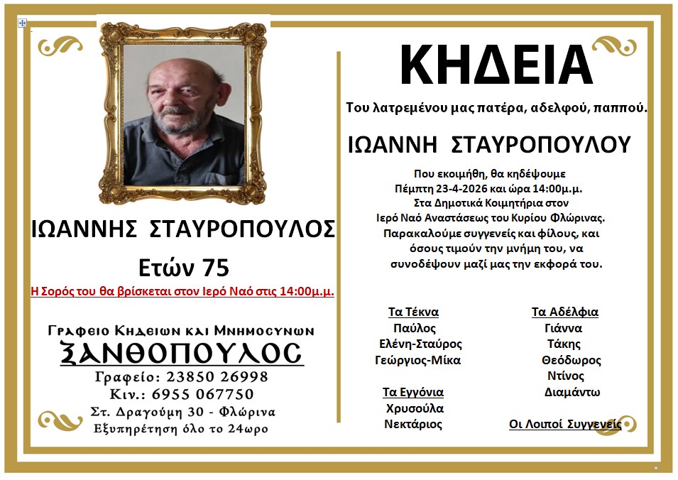 ΚοινωνικάΚηδεία του Ιωάννη Σταυρόπουλου, ετών 75 Τετάρτη 22 Απριλίου, 2026 12:28 florinapress.gr SHARE Ίσως να ενδιαφέρει ... Συλλυπητήρια επιστολή της ΔΚΜ Δυτικής Μακεδονίας Κηδεία της Δήμητρας Γρηγοριάδου, ετών 83 Ευχαριστήριο της Κοινωφελoύς Επιχείρησης του Δήμου Φλώρινας και του ΚΔΑΠμεΑ Κηδεία της Φούλας Σίση, ετών 88 Κηδεία της Βασιλικής Καραμήτσου Share Ακολουθήστε μας8.4kFollowersLikeΤελευταία νέα Συνελήφθη 28χρονος ημεδαπός, για διακίνηση ναρκωτικών ουσιών στην πόλη της Φλώρινας Κοινωνία Τετάρτη 22 Απριλίου, 2026 Ερώτηση Βουλευτών Νέας Αριστεράς για την απολιγνιτοποίηση χωρίς Δίκαιη Μετάβαση Πολιτική Τετάρτη 22 Απριλίου, 2026 Συγχαρητήριο μήνυμα Εσπερινού Γυμνασίου – Λυκείου Κοινωνία Τετάρτη 22 Απριλίου, 2026 Με τις θετικότερες των εντυπώσεων η «Μεγάλη γιορτή για την Ψυχική Υγεία» στο ΔΑΚ Φλώρινας Αθλητισμός Εκδηλώσεις Τετάρτη 22 Απριλίου, 2026