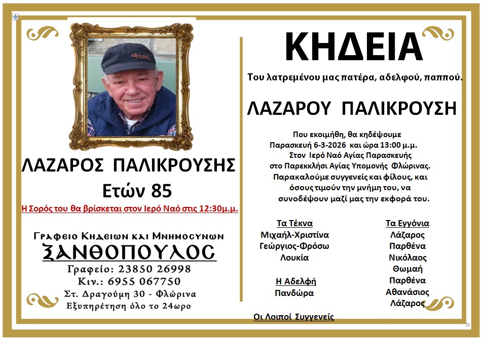 ΚοινωνικάΚηδεία του Λάζαρου Παλικρούση ετών 85 Πέμπτη 5 Μαρτίου, 2026 11:29 florinapress.gr SHARE Ίσως να ενδιαφέρει ... Κηδεία του Δημητρίου Νικολαΐδη Κηδεία της Πηνελόπης Πετροπούλου, ετών 77 Κηδεία του Χατζηκωνσταντίνου Νικολάου, ετών 72 Κηδεία του Βασιλείου Μητάνη, ετών 74 Κηδεία του Μιλτιάδη Τσώτσου ετών 82 Share Ακολουθήστε μας8.4kFollowersLikeΤελευταία νέα Εκδήλωση τιμής και διαλόγου για την Παγκόσμια Ημέρα της Γυναίκας Εκδηλώσεις Κοινωνία Πέμπτη 5 Μαρτίου, 2026 Πρόγραμμα: Ψηφιακή Εκπαίδευση και Ενδυνάμωση των Ατόμων με Αναπηρία» Κοινωνία Πέμπτη 5 Μαρτίου, 2026 Ευχαριστήριο του 1ου Γυμνασίου Φλώρινας Κοινωνία Τετάρτη 4 Μαρτίου, 2026 Κινηματογραφικές προβολές της Λέσχης Πολιτισμού Φλώρινας Πολιτισμός Τετάρτη 4 Μαρτίου, 2026