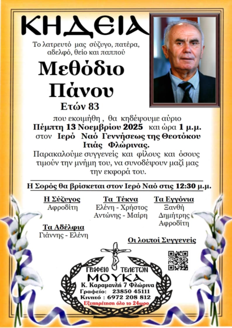 ΚοινωνικάΚηδεία του Μεθόδιου Πάνου, ετών 83 Τετάρτη 12 Νοεμβρίου, 2025 15:01 florinapress.gr SHARE Ίσως να ενδιαφέρει ... Ετήσιο μνημόσυνο της Ευγενίας Βλαστάκη – Κωτσοπούλου Ευχαριστήρια επιστολή του Πειραματικού Δημοτικού Σχολείου Φλώρινας Κηδεία της Άννας Παυλίδου, ετών 90 Μνημόσυνα Σαββάτου 16 και Κυριακής 17 Οκτωβρίου Κηδεία του Δημητρίου Μαυρόπουλου, ετών 79 Share Ακολουθήστε μας8.4kFollowersLikeΤελευταία νέα Αγανακτισμένοι αγρότες : Ως εδώ, η κατάσταση δεν πάει άλλο Κοινωνία Πέμπτη 4 Δεκεμβρίου, 2025 Επισκέψεις Κινητών Μονάδων Υγείας σε απομακρυσμένες Κοινότητες του Δήμου Αμυνταίου Κοινωνία Πέμπτη 4 Δεκεμβρίου, 2025 Ευχαριστήρια επιστολή του Πειραματικού Σχολείου Φλώρινας προς το Κέντρο Περιβαλλοντικής Εκπαίδευσης & Αειφορίας Μελίτης Κοινωνία Πέμπτη 4 Δεκεμβρίου, 2025 Πωλείται Γερμανικός λέβητας ξύλου Κοινωνία Πέμπτη 4 Δεκεμβρίου, 2025