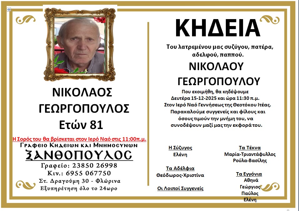 ΚοινωνικάΚηδεία του Νικολάου Γεωργόπουλου, ετών 81 Κυριακή 14 Δεκεμβρίου, 2025 11:31 florinapress.gr SHARE Ίσως να ενδιαφέρει ... Κηδεία του Ευάγγελου Τρυφωνίδη Κηδεία της Μαρίας Παράσχου Κηδεία της Βικτωρίας Καλπάκα Συλληπητήριο του ΦΣΦ «Ο ΑΡΙΣΤΟΤΕΛΗΣ» για τον Αλέξανδρο Σεχίδη Κηδεία του Περικλή Τρύφων, ετών 42 Share Ακολουθήστε μας8.4kFollowersLikeΤελευταία νέα Σ. Βόσδου: η συνέντευξη των Αμανατίδη-Τάσκα αγγίζει τα όρια της συκοφαντίας – Χ. Μπαρδάκας: η δική μας κριτική ασκείται με όρους σοβαρότητας και συνοδεύεται από προτάσεις Πολιτική Κυριακή 14 Δεκεμβρίου, 2025 Η Πέτη Πέρκα στη Βουλή: Προϋπολογισμός βγαλμένος από άλλη δεκαετία, σαν να μην υπάρχει κλιματική κρίση – Ο πλανήτης δεν αντέχει άλλη αναβολή Πολιτική Κυριακή 14 Δεκεμβρίου, 2025 Χριστουγεννιάτικη Γιορτή της ΣΚΑΕΠ του Πανεπιστημίου Δυτικής Μακεδονίας Εκδηλώσεις Πολιτισμός Κυριακή 14 Δεκεμβρίου, 2025 Εγκύκλιος Εράνου Αγάπης (Κυριακή 14 Δεκεμβρίου 2025) Κοινωνία Κυριακή 14 Δεκεμβρίου, 2025