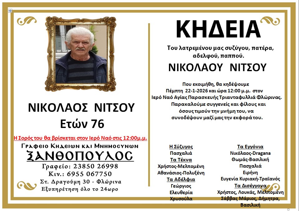 ΚοινωνικάΚηδεία του Νικολάου Νίτσου, ετών 76 Τετάρτη 21 Ιανουαρίου, 2026 20:57 florinapress.gr SHARE Ίσως να ενδιαφέρει ... Κηδεία της Αρετής Μηλιάγκου Κηδεία της Δόμνας Σταμπουλτζή Εκδόθηκαν τα οριστικά αποτελέσματα της προκήρυξης 7Ε/2018 Κηδεία της Μίνας Κίτσε, ετών 56 Κηδεία της Ευαγγελίας Τζήμα, ετών 53 Share Ακολουθήστε μας8.4kFollowersLikeΤελευταία νέα Σε ένα παράλληλο σύμπαν Κοινωνία Τετάρτη 21 Ιανουαρίου, 2026 5η Συνάντηση – Σχολείο για Γονείς Κοινωνία Τετάρτη 21 Ιανουαρίου, 2026 Η κοπή βασιλόπιτας και ο χορός του Συλλόγου Συνταξιούχων Δασκάλων και Νηπιαγωγών Ν. Φλώρινας Εκδηλώσεις Πολιτισμός Τετάρτη 21 Ιανουαρίου, 2026 Η κατάσταση στο οδικό δίκτυο της Περιφέρειας Δυτικής Μακεδονίας Κοινωνία Τετάρτη 21 Ιανουαρίου, 2026