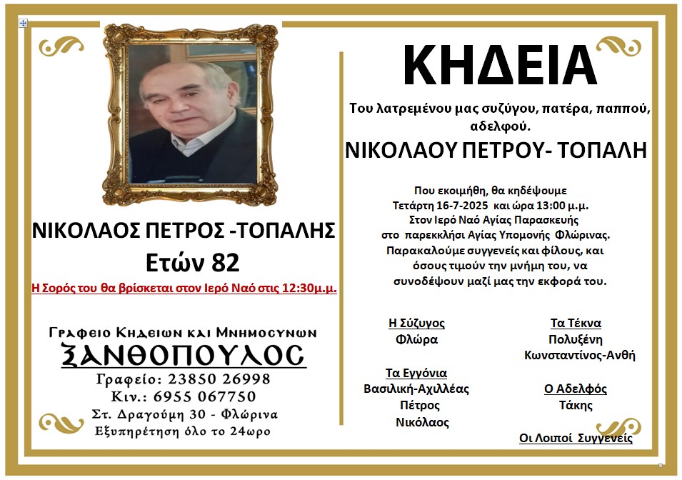 ΚοινωνικάΚηδεία του Νικολάου Πέτρου – Τοπάλη, ετών 82 Τρίτη 15 Ιουλίου, 2025 21:29 florinapress.gr SHARE Ίσως να ενδιαφέρει ... Κηδεία της Ευαγγελίας Γαύρου Κηδεία της Σταυρίδου Ζωής, ετών 79 Ευχαριστήριο προς το ιατρικό και νοσηλευτικό προσωπικό του Νοσοκομείου Φλώρινας Κηδεία της Γλυκερίας Παπαστεργίου, ετών 94 Κηδεία του Δημητρίου Δημόπουλου, ετών 73 Share Ακολουθήστε μας8.4kFollowersLikeΤελευταία νέα Αγανακτισμένοι αγρότες : Ως εδώ, η κατάσταση δεν πάει άλλο Κοινωνία Πέμπτη 4 Δεκεμβρίου, 2025 Επισκέψεις Κινητών Μονάδων Υγείας σε απομακρυσμένες Κοινότητες του Δήμου Αμυνταίου Κοινωνία Πέμπτη 4 Δεκεμβρίου, 2025 Ευχαριστήρια επιστολή του Πειραματικού Σχολείου Φλώρινας προς το Κέντρο Περιβαλλοντικής Εκπαίδευσης & Αειφορίας Μελίτης Κοινωνία Πέμπτη 4 Δεκεμβρίου, 2025 Πωλείται Γερμανικός λέβητας ξύλου Κοινωνία Πέμπτη 4 Δεκεμβρίου, 2025