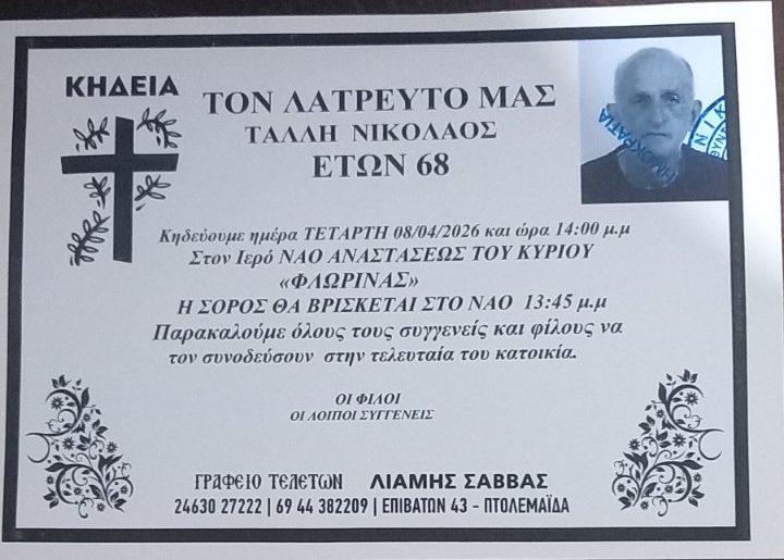 ΚοινωνικάΚηδεία του Νικολάου Τάλλη, ετών 68 Τρίτη 7 Απριλίου, 2026 21:19 florinapress.gr SHARE Ίσως να ενδιαφέρει ... Κηδεία του Θωμά Κωνσταντίνου Κηδεία του Ευάγγελου Αλεξίου ετών 70 Κηδεία του Γεωργίου Σταμπάνη, ετών 71 Κηδεία του Σταύρου Στεφανίδη, ετών 98 Κηδεία του Χαράλαμπου Μποντζίδη, ετών 73 Share Ακολουθήστε μας8.4kFollowersLikeΤελευταία νέα Ξεκίνησαν οι κοινές πασχαλινές επισκέψεις του Αντιπεριφερειάρχη και του Δημάρχου Φλώρινας Πολιτική Πολιτισμός Τρίτη 7 Απριλίου, 2026 Στ. Παπασωτηρίου: Ενίσχυση του Νοσοκομείου Φλώρινας με επικουρικούς ιατρούς Πολιτική Τρίτη 7 Απριλίου, 2026 «Φυσικό Αέριο Δυτικής Μακεδονίας» Με απόλυτη επιτυχία και πλήθος κόσμου το grand opening του νέου καταστήματος στην Καστοριά Κοινωνία Τρίτη 7 Απριλίου, 2026 Ευχαριστήριο του Κ.Κ.Π.Π.Δ.Μ σε Περιφερειακή Ενότητα Φλώρινας και Δήμο Φλώρινας Κοινωνία Τρίτη 7 Απριλίου, 2026