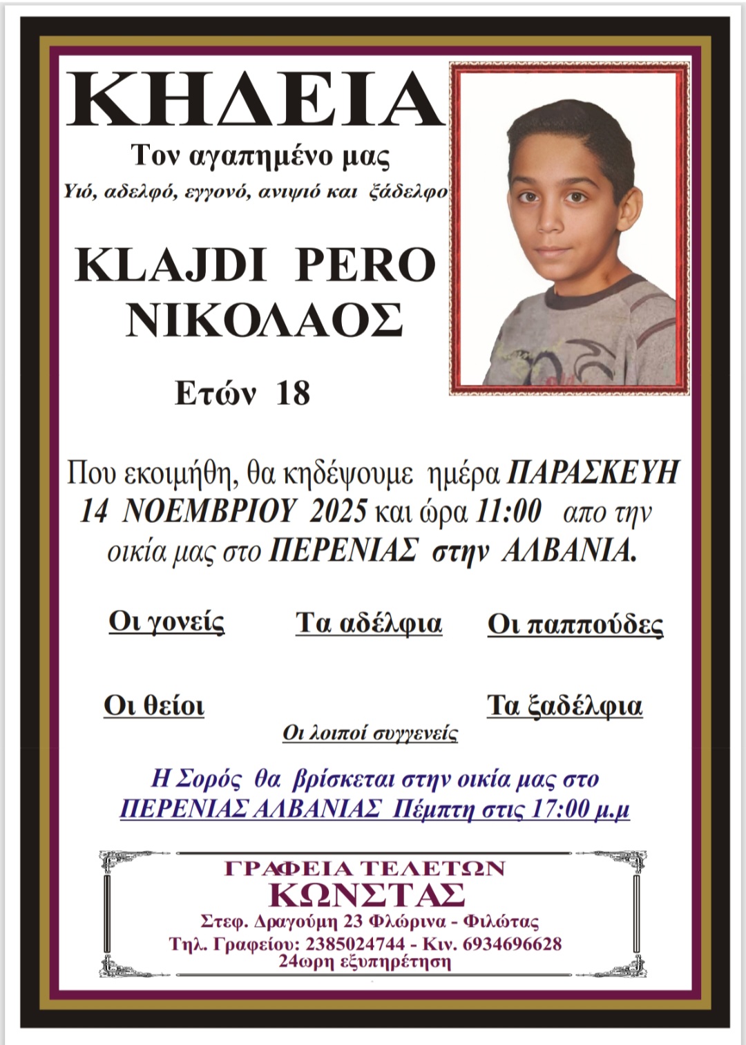 ΚοινωνικάΚηδεία του Νικολάου Klajdi Pero, ετών 18 Τετάρτη 12 Νοεμβρίου, 2025 19:14 florinapress.gr SHARE Ίσως να ενδιαφέρει ... Κηδεία του Νικολάου Δημητριάδη, ετών 84 Κηδεία της Πολυξένης Νικοπούλου, ετών 86 Μνημόσυνα Κυριακής 14 Μαρτίου Κηδεία του Λεωνίδα Κοσκοσίδη, ετών 102 Κηδεία της Ευδοξίας Παπαθανασίου Share Ακολουθήστε μας8.4kFollowersLikeΤελευταία νέα Αγανακτισμένοι αγρότες : Ως εδώ, η κατάσταση δεν πάει άλλο Κοινωνία Πέμπτη 4 Δεκεμβρίου, 2025 Επισκέψεις Κινητών Μονάδων Υγείας σε απομακρυσμένες Κοινότητες του Δήμου Αμυνταίου Κοινωνία Πέμπτη 4 Δεκεμβρίου, 2025 Ευχαριστήρια επιστολή του Πειραματικού Σχολείου Φλώρινας προς το Κέντρο Περιβαλλοντικής Εκπαίδευσης & Αειφορίας Μελίτης Κοινωνία Πέμπτη 4 Δεκεμβρίου, 2025 Πωλείται Γερμανικός λέβητας ξύλου Κοινωνία Πέμπτη 4 Δεκεμβρίου, 2025