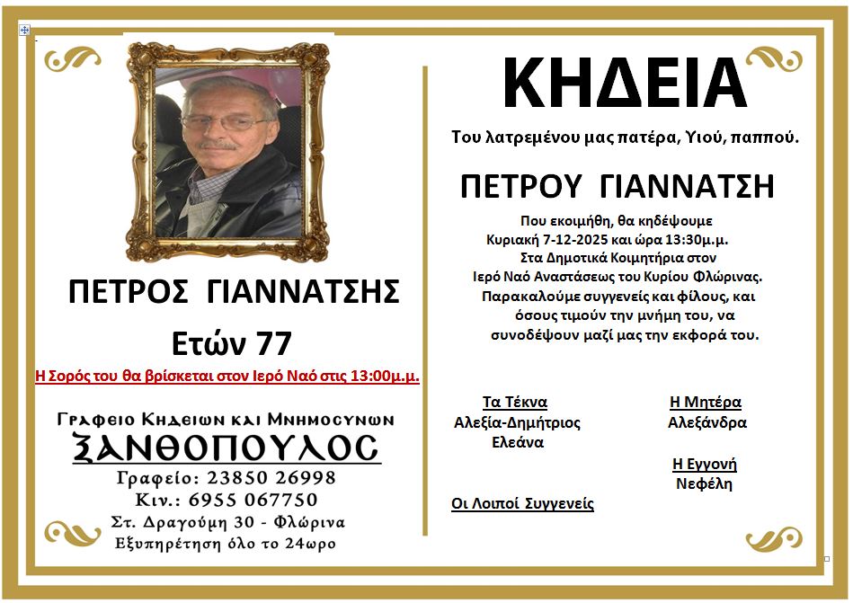 ΚοινωνικάΚηδεία του Πέτρου Γιαννάτση ετών 77 Σάββατο 6 Δεκεμβρίου, 2025 12:02 florinapress.gr SHARE Ίσως να ενδιαφέρει ... Κηδεία της Παρασκευής Γρίβα, ετών 74 Τριετές μνημόσυνο της Μαρίας Χαϊδάρη Κηδεία του Κωνσταντίνου Ιωαννίδη, ετών 61 Κηδεία Λάζαρου Μαυρομάτη ετών 86 Κηδεία του Νικολάου Παυλίδη, ετών 92 Share Ακολουθήστε μας8.4kFollowersLikeΤελευταία νέα Συλλυπητήριο μήνυμα του Επιμελητηρίου Φλώρινας Κοινωνία Σάββατο 6 Δεκεμβρίου, 2025 Διακοπή υδροδότησης σε τμήματα της πόλης της Φλώρινας Κοινωνία Σάββατο 6 Δεκεμβρίου, 2025 Κηδεία του Αλέξανδρου Αλεξίου ετών 93 Κοινωνικά Σάββατο 6 Δεκεμβρίου, 2025 Το Χριστουγεννιάτικο Bazaar του ΚΕΦΙΑΠ Φλώρινας Εκδηλώσεις Πολιτισμός Παρασκευή 5 Δεκεμβρίου, 2025