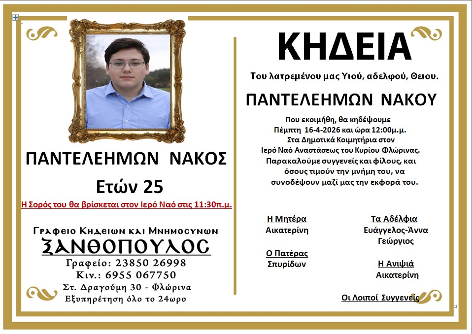 ΚοινωνικάΚηδεία του Παντελεήμονος Νάκου ετών 25 Τετάρτη 15 Απριλίου, 2026 12:06 florinapress.gr SHARE Ίσως να ενδιαφέρει ... Κηδεία της Σοφίας Μαυρίδου ετών 79 Κηδεία του Παντελή Μήντσε, ετών 62 Κηδεία του Ευάγγελου Βραγγάλα Κηδεία του Αθανασίου Καϊμακάμη, ετών 79 Κηδεία του Ιωάννη Μαυρουδή, ετών 62 Share Ακολουθήστε μας8.4kFollowersLikeΤελευταία νέα Νέα Πρόσκληση 2,78 εκατ. ευρώ για δράσεις Πολιτισμού στην Φλώρινα Οικονομία Πολιτική Πολιτισμός Παρασκευή 17 Απριλίου, 2026 Διημερίδα «Εικαστικές τέχνες: Κέντρο και περιφέρεια» Εκδηλώσεις Πολιτισμός Παρασκευή 17 Απριλίου, 2026 Άρθρο – Αφιέρωμα στον Χάιντς-Δάριο Κούνιο Επιστολές Κοινωνία Παρασκευή 17 Απριλίου, 2026 Εκδηλώσεις του Συλλόγου – Συνδέσμου Αποστράτων Σωμάτων Ασφάλειας Νομού Φλώρινας η ”Αγία Ειρήνη” Εκδηλώσεις Κοινωνία Παρασκευή 17 Απριλίου, 2026
