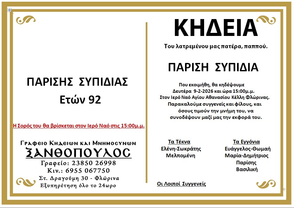 ΚοινωνικάΚηδεία του Παρίση Συπιδία, ετών 92 Κυριακή 8 Φεβρουαρίου, 2026 19:35 florinapress.gr SHARE Ίσως να ενδιαφέρει ... Μνημόσυνα Σαββάτου 11 Ιουνίου Κηδεία της Ελένης Μιχάλτση, ετών 85 Κηδεία του Χρήστου Μήσιου ετών 78 Κηδεία της Χρυσάνθης Κόζη, ετών 79 Κηδεία του Ιωάννη Ευαγγέλου, ετών 43 Share Ακολουθήστε μας8.4kFollowersLikeΤελευταία νέα Κοπή βασιλόπιτας του Αστυνομικού τμήματος Βεύης Πολιτισμός Κυριακή 8 Φεβρουαρίου, 2026 Κηδεία του Θωμά Στεργίου, ετών 81 Κοινωνικά Κυριακή 8 Φεβρουαρίου, 2026 Πέτη Πέρκα: Η Νεφέλη Τίτα έγραψε ιστορία – Υπερηφάνεια για τη Φλώρινα και τον ελληνικό αθλητισμό! Κοινωνία Πολιτική Κυριακή 8 Φεβρουαρίου, 2026 Ο Γρηγόρης Δημητριάδης στην κοπή πίτας της ΝΔ Θεσσαλονίκης (video & photos) Πολιτική Κυριακή 8 Φεβρουαρίου, 2026