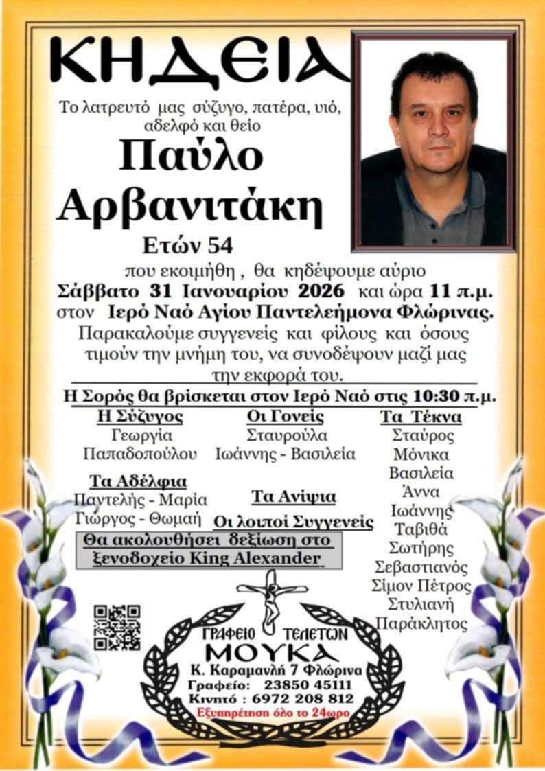 ΚοινωνικάΚηδεία του Παύλου Αρβανιτάκη, ετών 54 Παρασκευή 30 Ιανουαρίου, 2026 15:01 florinapress.gr SHARE Ίσως να ενδιαφέρει ... Κηδεία της Βασιλικής Καρκαρέτση Κηδεία του Ιωάννη Ξαντινίδη Συγχαρητήριο της Γυμναστική Ένωση Φλώρινας Κηδεία του Μιχαήλ Ναλπαντίδη, ετών 94 Κατάθεση 300 ευρώ στη μνήμη του μεγάλου χοροδιδάσκαλου Βασίλη Παπαχρήστου από τον Π.Σ. “Η Παράδοση” Share Ακολουθήστε μας8.4kFollowersLikeΤελευταία νέα Tο πρόγραμμα της εκδρομής που διοργανώνει ο Σύλλογος Συνταξιούχων Δασκάλων & Νηπιαγωγών Κοινωνία Πέμπτη 19 Φεβρουαρίου, 2026 Επίσκεψη μαθητών του 3ου Δημοτικού Σχολείου Αμυνταίου στο Δημαρχείο Κοινωνία Πολιτική Πέμπτη 19 Φεβρουαρίου, 2026 Εθιμοτυπική επίσκεψη του Διοικητή της 9ης Ταξιαρχίας Μ.Π. στον Δήμαρχο Αμυνταίου Πολιτική Πέμπτη 19 Φεβρουαρίου, 2026 Συγχαρητήριο μήνυμα του βουλευτή Στ. Παπασωτηρίου προς τον Συνταγματάρχη Ανέστη Ανέστη για την παραλαβή Διοικήσεως του 1ου Συντάγματος Πεζικού Πολιτική Πέμπτη 19 Φεβρουαρίου, 2026