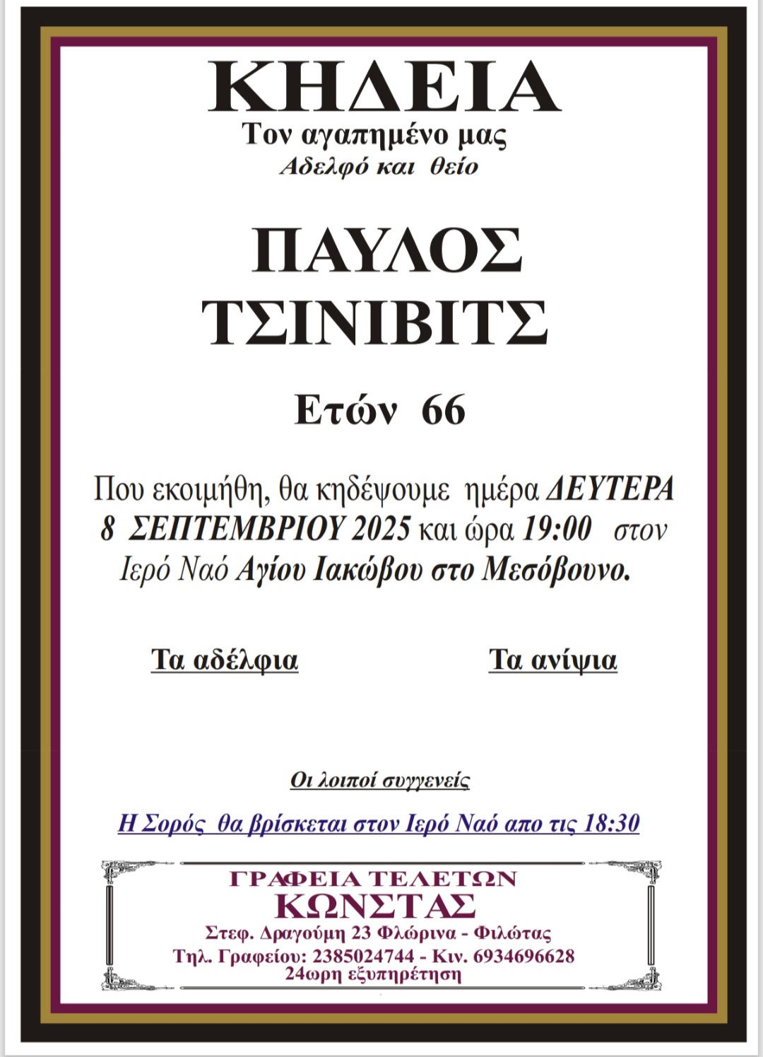 ΚοινωνικάΚηδεία του Παύλου Τσίνιβιτς, ετών 66 Κυριακή 7 Σεπτεμβρίου, 2025 23:33 florinapress.gr SHARE Ίσως να ενδιαφέρει ... Κηδεία της Παρασκευής Γρίβα, ετών 74 Κηδεία της Βιολέττας Ευαγγέλου, ετών 63 Μνημόσυνα Σαββάτου 16 και Κυριακής 17 Μαρτίου Κηδεία της Παρθένας Μωυσιάδου, ετών 84 Κηδεία του Ιωσήφ Ρασίτ, ετών 80 Share Ακολουθήστε μας8.4kFollowersLikeΤελευταία νέα Αγανακτισμένοι αγρότες : Ως εδώ, η κατάσταση δεν πάει άλλο Κοινωνία Πέμπτη 4 Δεκεμβρίου, 2025 Επισκέψεις Κινητών Μονάδων Υγείας σε απομακρυσμένες Κοινότητες του Δήμου Αμυνταίου Κοινωνία Πέμπτη 4 Δεκεμβρίου, 2025 Ευχαριστήρια επιστολή του Πειραματικού Σχολείου Φλώρινας προς το Κέντρο Περιβαλλοντικής Εκπαίδευσης & Αειφορίας Μελίτης Κοινωνία Πέμπτη 4 Δεκεμβρίου, 2025 Πωλείται Γερμανικός λέβητας ξύλου Κοινωνία Πέμπτη 4 Δεκεμβρίου, 2025