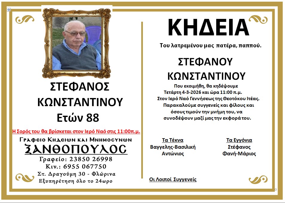 ΚοινωνικάΚηδεία του Στέφανου Κωνσταντίνου, ετών 88 Τρίτη 3 Μαρτίου, 2026 13:45 florinapress.gr SHARE Ίσως να ενδιαφέρει ... Κηδεία του Ιωάννη Στάιου, ετών 65 Κηδεία του Αθανάσιου Νικολάου ετών 90 Κηδεία της Μαρίας Γιουρούκη, ετών 89 Κηδεία της Αναστασίας Σαλαπάνη, ετών 88 Μνημόσυνα Κυριακής 30 Μαϊου Share Ακολουθήστε μας8.4kFollowersLikeΤελευταία νέα Επικαιροποίηση στοιχείων στο Κοινωνικό Παντοπωλείο Δήμου Αμυνταίου Κοινωνία Τρίτη 3 Μαρτίου, 2026 Με επιτυχία πραγματοποιήθηκε η πρώτη ομαδική πεζοπορία στα μονοπάτια του Αετού Κοινωνία Περιβάλλον Τρίτη 3 Μαρτίου, 2026 Ενημερωτικές δράσεις για την υγεία και την υγιεινή της έμμηνου ρύσης από το Κέντρο Κοινότητας Δήμου Φλώρινας Κοινωνία Τρίτη 3 Μαρτίου, 2026 Η Χορωδία του ΚΑΠΗ Δήμου Φλώρινας στη Συνάντηση Χορωδιών ΚΑΠΗ «Άνοιξη στην Έδεσσα» Εκδηλώσεις Πολιτισμός Τρίτη 3 Μαρτίου, 2026