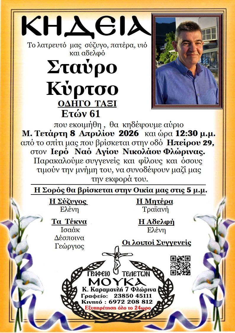 ΚοινωνικάΚηδεία του Σταύρου Κύρτσου, ετών 61 Τρίτη 7 Απριλίου, 2026 08:24 florinapress.gr SHARE Ίσως να ενδιαφέρει ... Κηδεία του Γεωργίου Ηλιόπουλου, ετών 90 Κηδεία του Ιωάννη Ντουβαρτζίδη, ετών 88 Κηδεία της Αθηνάς Δεμίρη, ετων 85 Ευχαριστήριο του Φώτη Σαπαρδάνη Κηδεία του Αντωνίου Μυλωνά, ετών 57 Share Ακολουθήστε μας8.4kFollowersLikeΤελευταία νέα Κηδεία της Σουλτάνας Βεράνη, ετών 84 Κοινωνικά Δευτέρα 6 Απριλίου, 2026 Απαγόρευση αλιείας στην Π.Ε. Φλώρινας Κοινωνία Δευτέρα 6 Απριλίου, 2026 Κηδεία του Γεωργίου Σονιάδη, ετών 86 Κοινωνικά Δευτέρα 6 Απριλίου, 2026 Πέτη Πέρκα από το βήμα της Βουλής: Δεν μιλάμε για «παθογένειες», αλλά μιλάμε για καθεστώς και για ανεξέλεγκτη εξουσία Πολιτική Δευτέρα 6 Απριλίου, 2026
