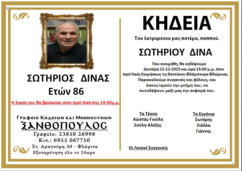 ΚοινωνικάΚηδεία του Σωτηρίου Δίνα, ετών 86 Κυριακή 21 Δεκεμβρίου, 2025 20:48 florinapress.gr SHARE Ίσως να ενδιαφέρει ... Κηδεία της Ελένης Γεωργιάδου Κηδεία της Παρασκευής Γρίβα, ετών 74 Κηδεία του Παντελή Μελίτση ετών 44 Συλλυπητήριο του 1ου ΓΕΛ Φλώρινας Κηδεία του Γρηγόρη Καραστεργίου ετών 75 Share Ακολουθήστε μας8.4kFollowersLikeΤελευταία νέα Η Χριστουγεννιάτικη Χορωδιακή Συναυλία στον «Αριστοτέλη» Εκδηλώσεις Πολιτισμός Κυριακή 21 Δεκεμβρίου, 2025 Η εκδήλωση «Από μια συμπεριληπτική εκπαίδευση για μια κοινωνία χωρίς αποκλεισμούς» Εκδηλώσεις Πολιτισμός Κυριακή 21 Δεκεμβρίου, 2025 Με μεγάλη επιτυχία πραγματοποιήθηκε η ενημερωτική εκδήλωση για την οστεοπόρωση στον Δήμο Αμυνταίου Εκδηλώσεις Πολιτισμός Κυριακή 21 Δεκεμβρίου, 2025 Υπογραφή σύμβασης για το έργο «Ίδρυση, Ανάδειξη και Βελτίωση Δικτύου Μονοπατιών Δήμου Πρεσπών» Πολιτική Κυριακή 21 Δεκεμβρίου, 2025