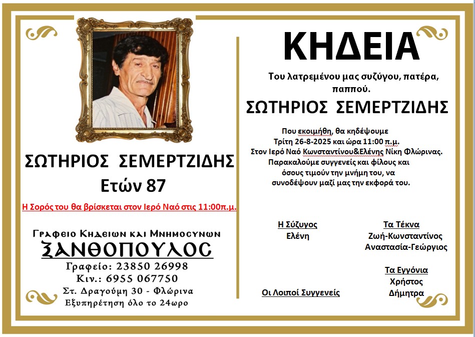 ΚοινωνικάΚηδεία του Σωτηρίου Σεμερτζίδη ετών 87 Δευτέρα 25 Αυγούστου, 2025 12:30 florinapress.gr SHARE Ίσως να ενδιαφέρει ... Διοργάνωση του Ετήσιου χορού του Λυκείου των Ελληνίδων Φλώρινας Συγχαρητήριο μήνυμα του Αντιπεριφερειάρχη Φλώρινας Αθανάσιου Τάσκα στους νέους Διοικητές της Περιφερειακής Πυροσβεστικής Διοίκησης Δυτικής Μακεδονίας και της Πυροσβεστικής Υπηρεσίας Φλώρινας Συνελήφθη 19χρονος ημεδαπός, παραλήπτης ταχυδρομικού δέματος, το οποίο περιείχε ναρκωτικά Ενδεκαετές μνημόσυνο π. Αυγουστίνου Καντιώτου (φωτογραφίες) 4η ανακοίνωση για τις εκταφές στο κοιμητήριο “Αναστάσεως του Κυρίου” της Φλώρινας Share Ακολουθήστε μας8.4kFollowersLikeΤελευταία νέα Αγανακτισμένοι αγρότες : Ως εδώ, η κατάσταση δεν πάει άλλο Κοινωνία Πέμπτη 4 Δεκεμβρίου, 2025 Επισκέψεις Κινητών Μονάδων Υγείας σε απομακρυσμένες Κοινότητες του Δήμου Αμυνταίου Κοινωνία Πέμπτη 4 Δεκεμβρίου, 2025 Ευχαριστήρια επιστολή του Πειραματικού Σχολείου Φλώρινας προς το Κέντρο Περιβαλλοντικής Εκπαίδευσης & Αειφορίας Μελίτης Κοινωνία Πέμπτη 4 Δεκεμβρίου, 2025 Πωλείται Γερμανικός λέβητας ξύλου Κοινωνία Πέμπτη 4 Δεκεμβρίου, 2025