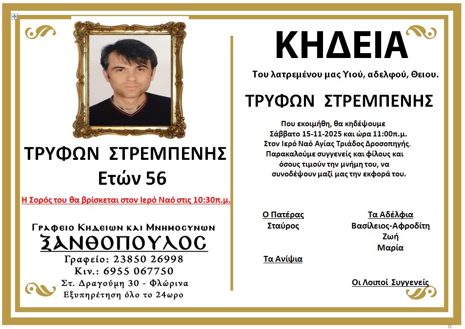 ΚοινωνικάΚηδεία του Τρύφωνος Στρεμπένη, ετών 56 Παρασκευή 14 Νοεμβρίου, 2025 12:05 florinapress.gr SHARE Ίσως να ενδιαφέρει ... Κηδεία της Μαρίας Γκατζοπούλου Κηδεία της Παρασκευής Τουτσίδου Κηδεία του Θωμά Τσώτσου, ετών 57 Κηδεία του Γεράσιμου Χαρίση, ετών 93 Κηδεία της Φανής Γεωργίου Share Ακολουθήστε μας8.4kFollowersLikeΤελευταία νέα Αγανακτισμένοι αγρότες : Ως εδώ, η κατάσταση δεν πάει άλλο Κοινωνία Πέμπτη 4 Δεκεμβρίου, 2025 Επισκέψεις Κινητών Μονάδων Υγείας σε απομακρυσμένες Κοινότητες του Δήμου Αμυνταίου Κοινωνία Πέμπτη 4 Δεκεμβρίου, 2025 Ευχαριστήρια επιστολή του Πειραματικού Σχολείου Φλώρινας προς το Κέντρο Περιβαλλοντικής Εκπαίδευσης & Αειφορίας Μελίτης Κοινωνία Πέμπτη 4 Δεκεμβρίου, 2025 Πωλείται Γερμανικός λέβητας ξύλου Κοινωνία Πέμπτη 4 Δεκεμβρίου, 2025