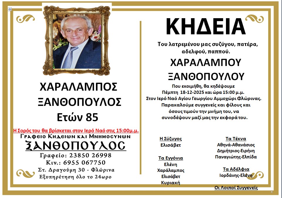 ΚοινωνικάΚηδεία του Χαράλαμπου Ξανθόπουλου, ετών 85 Τετάρτη 17 Δεκεμβρίου, 2025 18:55 florinapress.gr SHARE Ίσως να ενδιαφέρει ... Κηδεία του Μιλτιάδη Τσώτσου ετών 82 Κηδεία του Ορθοπαιδικού Γεωργίου Χολέρη ετών 81 Κηδεία της Παρασκευής Δούκα, ετών 90 Κηδεία του Χρήστου Μαρκόπουλου, ετών 62 Κηδεία του Πέτρου Στόγιου, ετών 93 Share Ακολουθήστε μας8.4kFollowersLikeΤελευταία νέα Στ. Παπασωτηρίου: «Μέτρα για τις πληγείσες περιοχές της Φλώρινας» Πολιτική Τετάρτη 17 Δεκεμβρίου, 2025 Επίσκεψη του Αντιπεριφερειάρχη Φλώρινας Αθανάσιου Τάσκα σε δομές, εμπορικά καταστήματα και δημοτική αγορά της Φλώρινας, ενόψει των εορτών Χριστουγέννων και της Πρωτοχρονιάς Πολιτισμός Τετάρτη 17 Δεκεμβρίου, 2025 Χριστουγεννιάτικες ευχές από το φοιτητικό τμήμα των “Λυγκηστών” Πολιτισμός Τετάρτη 17 Δεκεμβρίου, 2025 Χριστουγεννιάτικη Γιορτή από το Σωματείο Ελληνικών Παραδοσιακών Χορών «Λυγκηστές» Εκδηλώσεις Πολιτισμός Τετάρτη 17 Δεκεμβρίου, 2025