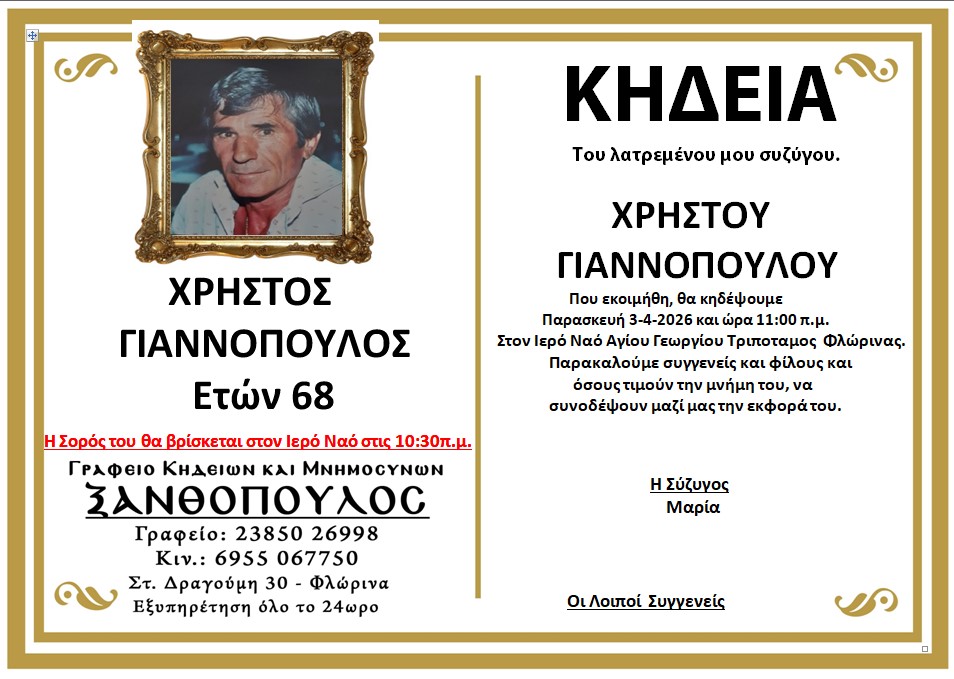 ΚοινωνικάΚηδεία του Χρήστου Γιαννόπουλου, ετών 68 Πέμπτη 2 Απριλίου, 2026 12:39 florinapress.gr SHARE Ίσως να ενδιαφέρει ... Κηδεία του Κώστα Δημητρίου (Κούδα) Ετήσιο μνημόσυνο του Γεωργίου Μαντόπουλου Κηδεία της Ευαγγελίας Δίβιου, ετών 92 Κηδεία του Λάζαρου Μπόσκου Κηδεία της Σοφίας Σάββα, ετών 97 Share Ακολουθήστε μας8.4kFollowersLikeΤελευταία νέα Με μεγάλη συμμετοχή μελών πραγματοποιήθηκε η εκλογοαπολογιστική συνέλευση του μεγαλύτερου συλλόγου της πόλης μας, Φ.Σ.Φ. «Ο Αριστοτέλης» Κοινωνία Πολιτισμός Τετάρτη 1 Απριλίου, 2026 Συλλυπητήριο μήνυμα του 2ου Δημοτικού Σχολείου Φλώρινας Κοινωνία Τετάρτη 1 Απριλίου, 2026 Επίσκεψη εκπροσώπων του ΚΑΠΗ Αμυνταίου στο Νηπιαγωγείο Ξινού Νερού ενόψει του Πάσχα Κοινωνία Τετάρτη 1 Απριλίου, 2026 Ευχαριστήριο του 1ου Γυμνασίου Φλώρινας Κοινωνία Τετάρτη 1 Απριλίου, 2026