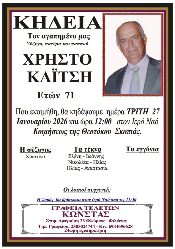 ΚοινωνικάΚηδεία του Χρήστου Κάϊτση, ετών 71 Δευτέρα 26 Ιανουαρίου, 2026 11:42 florinapress.gr SHARE Ίσως να ενδιαφέρει ... Κηδεία της Αθηνάς Κομματά, ετών 78 Κηδεία της Ολυμπίας Κωνσταντινοπούλου, ετών 83 Κηδεία του Στέφανου Γυφτόπουλου, ετών 87 Κηδεία του Συμεών Μπελμπάση, ετών 79 Κηδεία του Δημητρίου Παπανικολάου Share Ακολουθήστε μας8.4kFollowersLikeΤελευταία νέα Κοπή βασιλόπιτας των Συλλόγων Ατόμων με Αναπηρία και Γονέων και Κηδεμόνων Ατόμων με Αναπηρία Φλώρινας Πολιτισμός Δευτέρα 26 Ιανουαρίου, 2026 Συνεδριάζει το Δημοτικό Συμβούλιο Φλώρινας Πολιτική Δευτέρα 26 Ιανουαρίου, 2026 Με δύο νίκες στην 4η θέση οι Σάρισες στην Α1 Αθλητισμός Δευτέρα 26 Ιανουαρίου, 2026 Πραγματοποιήθηκε η εκδήλωση κοπής της βασιλόπιτας του ΑΠΣ Φλώρινας Shogun Αθλητισμός Δευτέρα 26 Ιανουαρίου, 2026